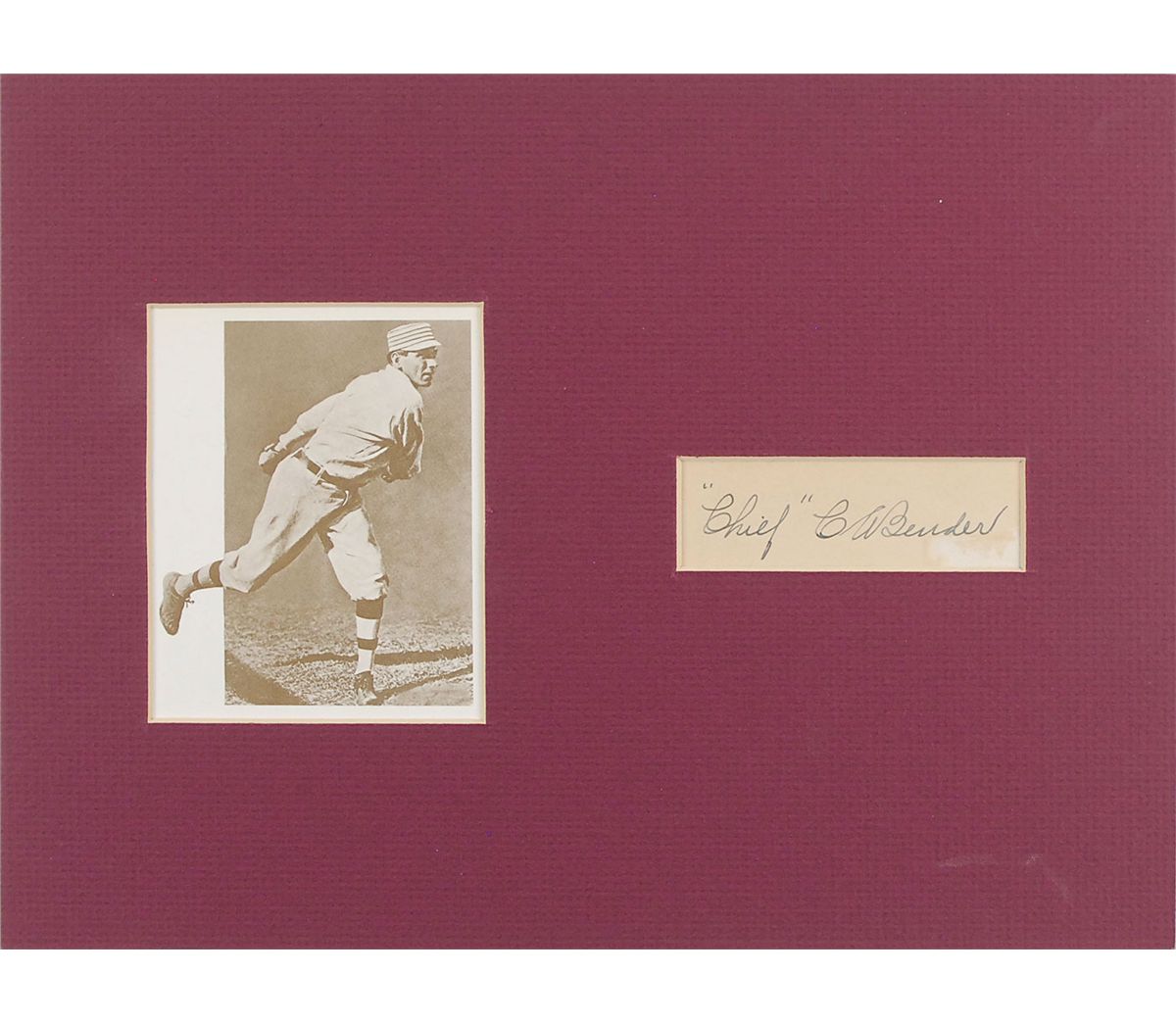 Much-lauded baseball pitcher (1884–1954) inducted into the Hall of Fame in 1953, a year before his death. Vintage fountain pen signature, “‘Chief’ C A Bender,” on an off-white album page. Matted with a printed photo of Bender in uniform to an overall size of 12 x 9. In fine condition, with some slight surface loss under last name of signature.