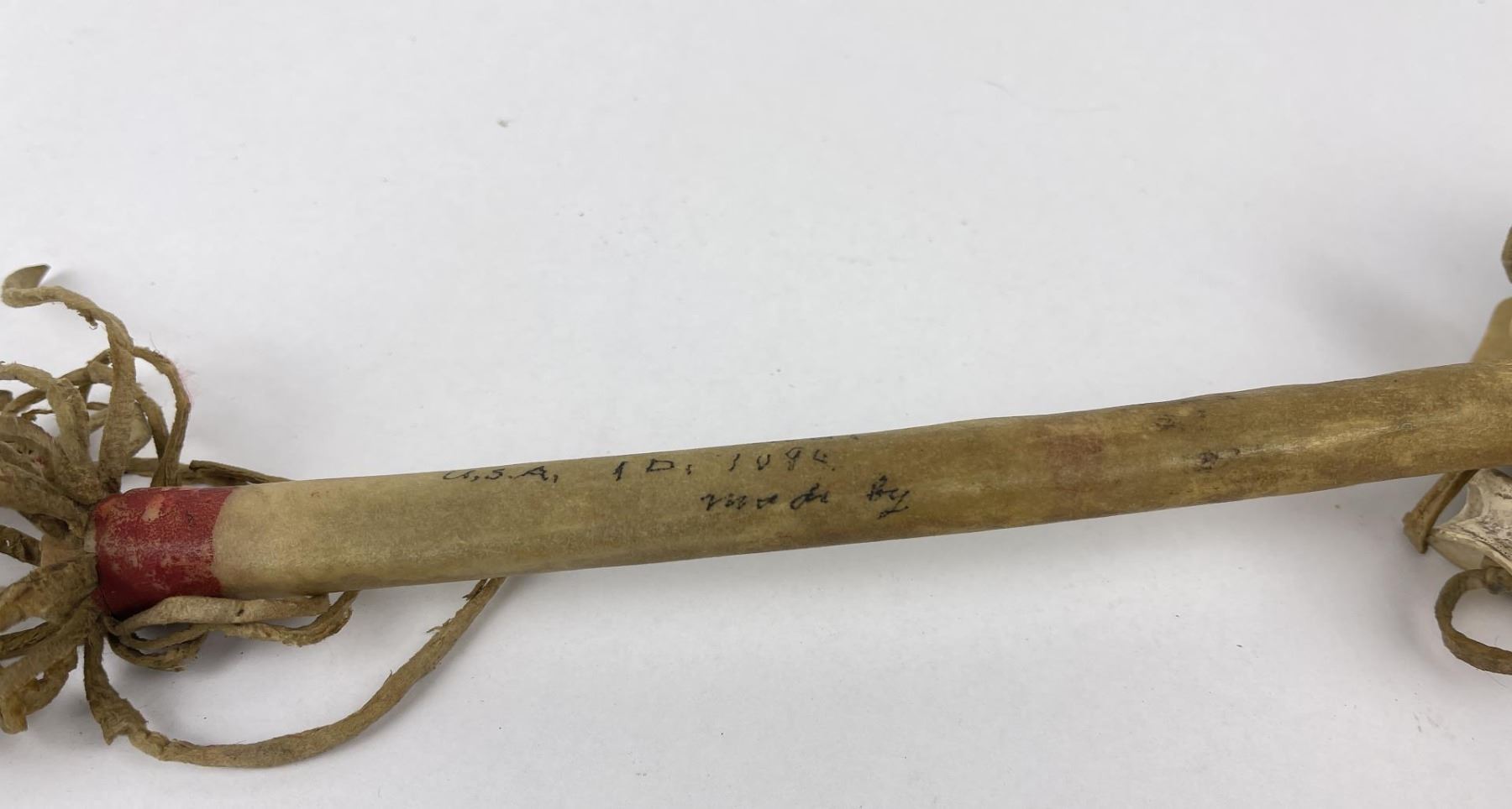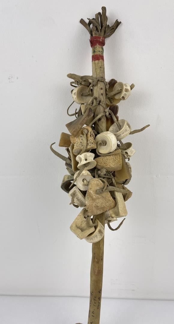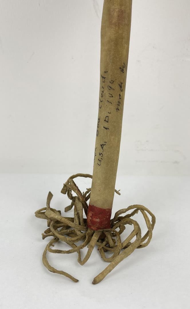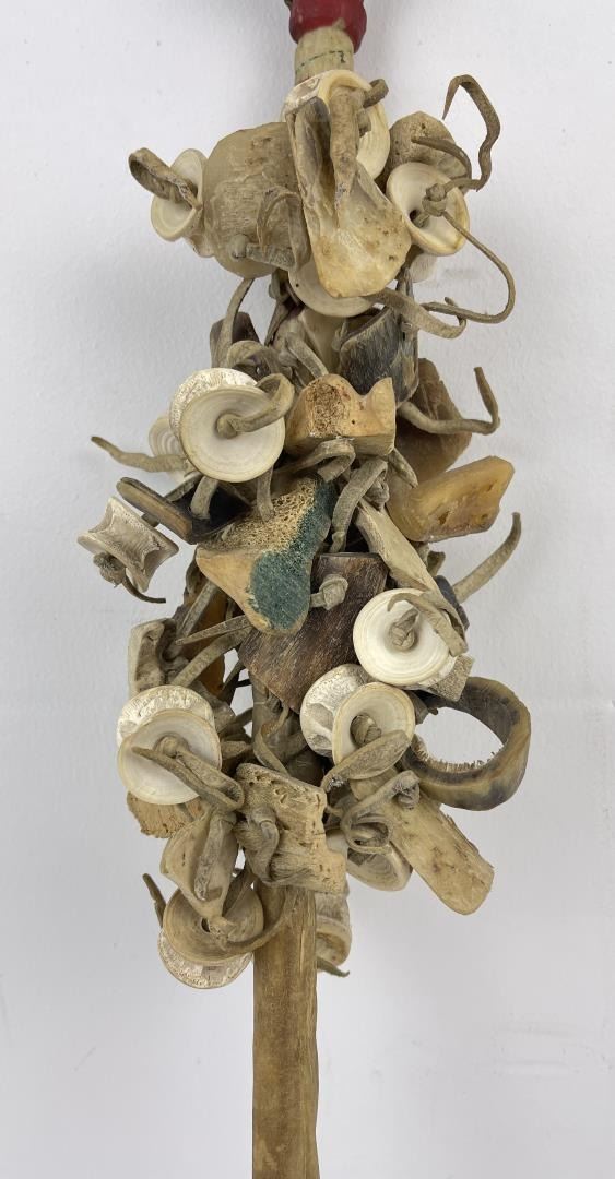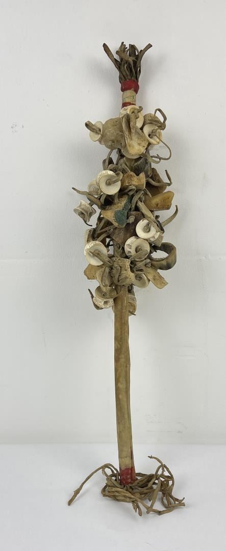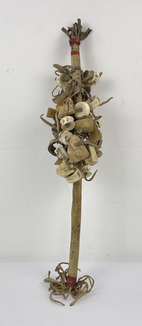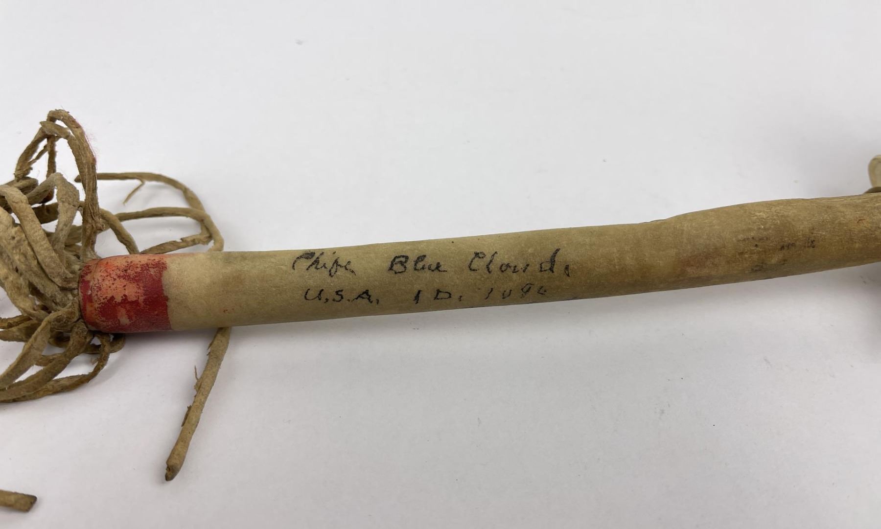 Chief Blue Cloud Toured with the Buffalo Bill Wild West Show. This was his rattle. It is identified on the haft as shown. 19" long. Chief Blue Cloud was born on the Pine Ridge Reservation in South Dakota in 1870. His Grandfather Red Cloud fought in the Little Big Horn, and was the brother of Sitting Bull. Blue Cloud spent 21 years touring America and the East with the Buffalo Bill Wild West Show. He was also famous for making Indian War Bonnets, and even gifted one to Teddy Roosevelt. Blue Cloud Died in 1951 in Detroit.