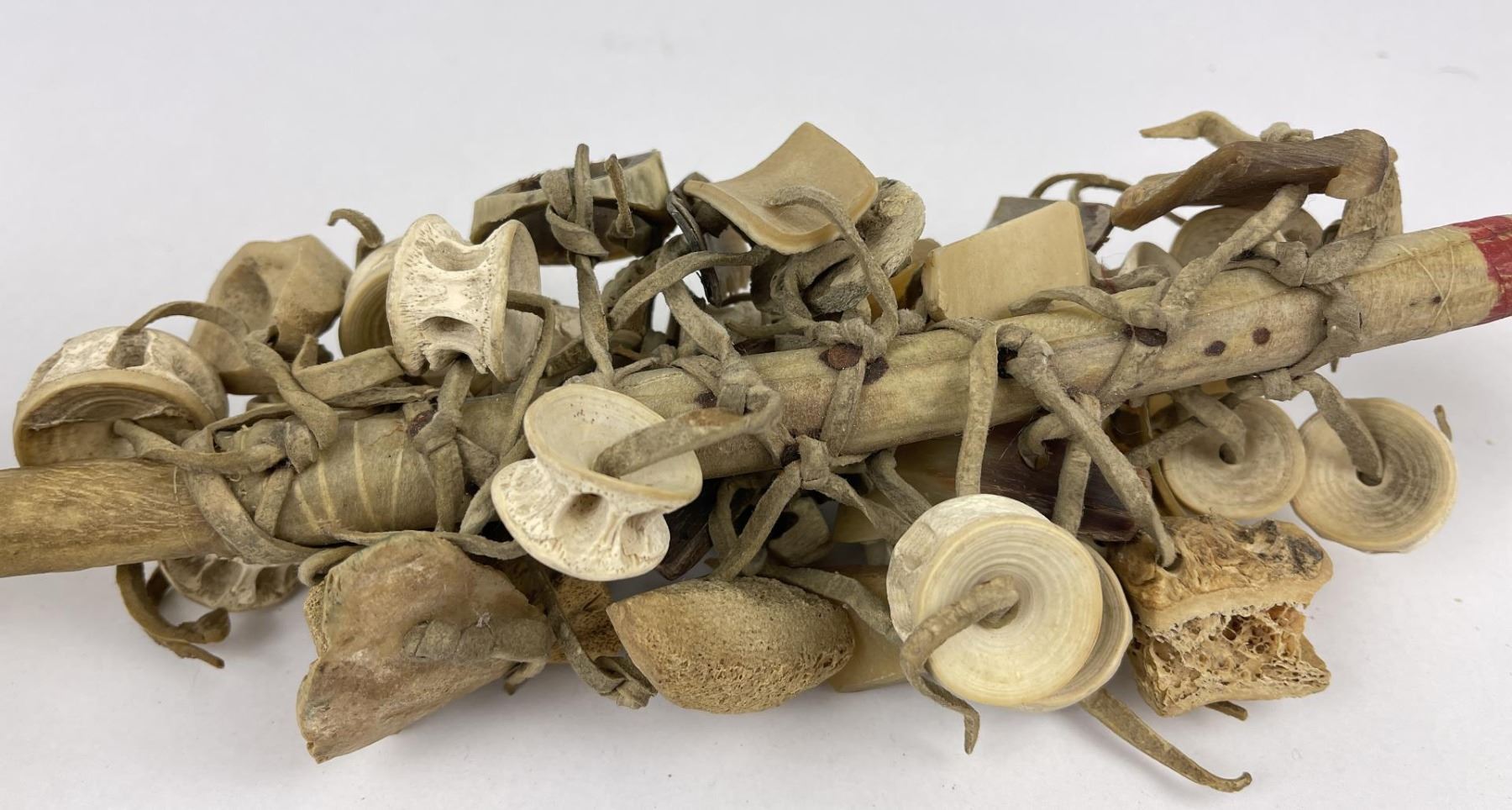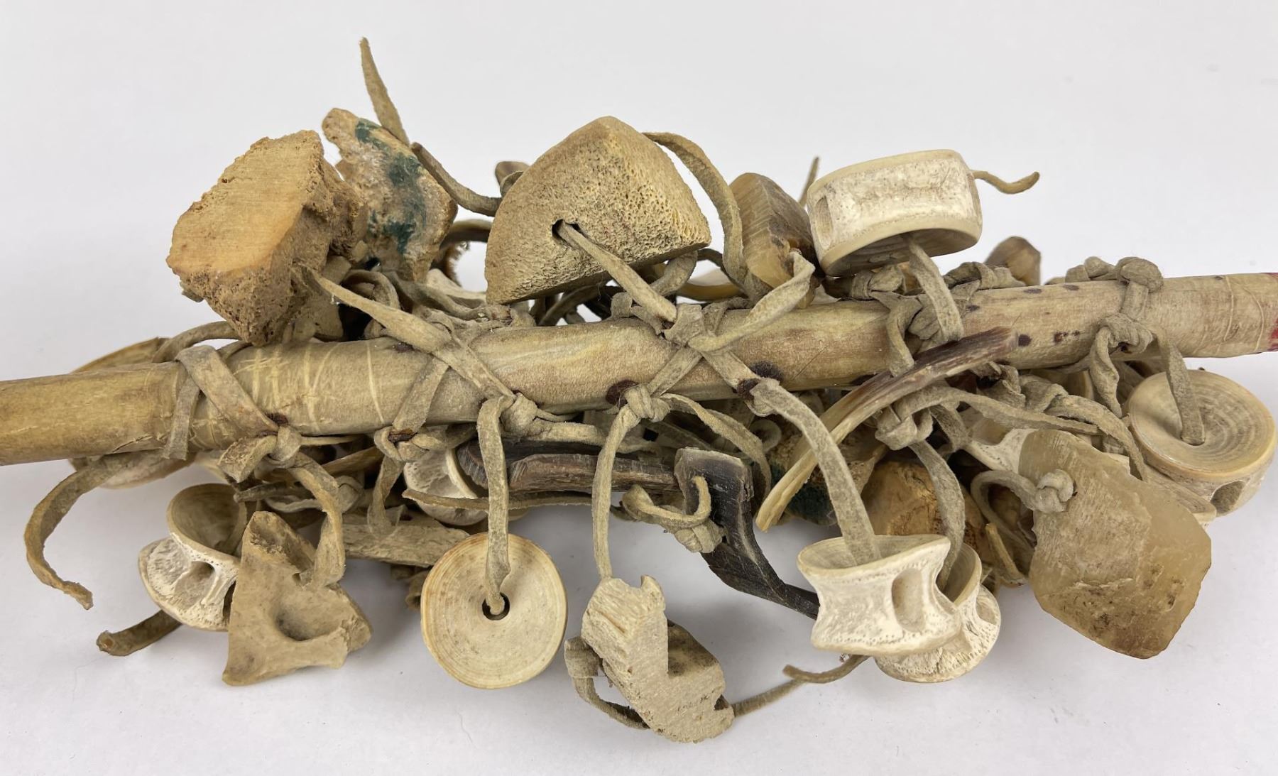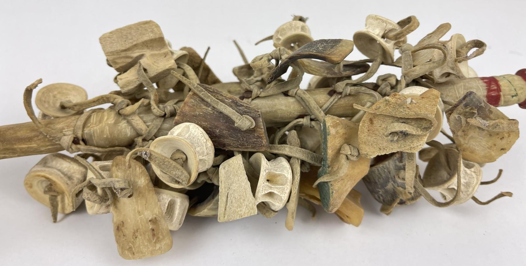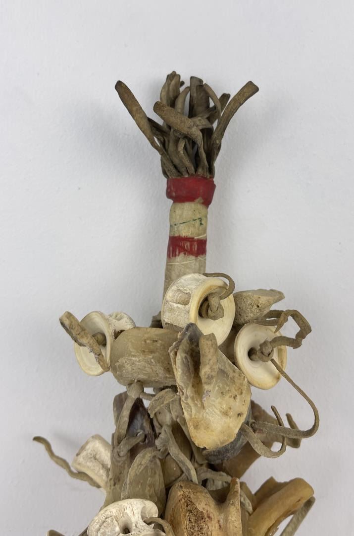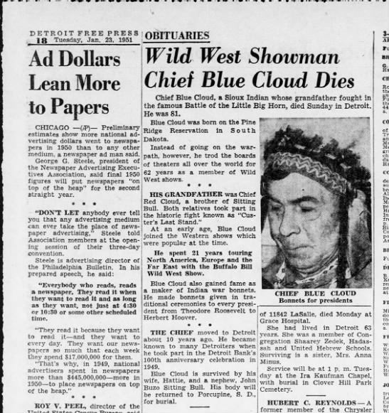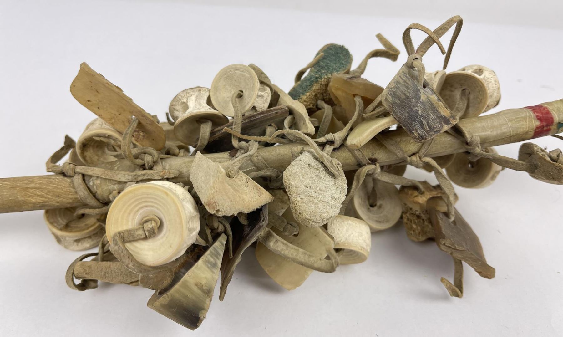Chief Blue Cloud Toured with the Buffalo Bill Wild West Show. This was his rattle. It is identified on the haft as shown. 19" long. Chief Blue Cloud was born on the Pine Ridge Reservation in South Dakota in 1870. His Grandfather Red Cloud fought in the Little Big Horn, and was the brother of Sitting Bull. Blue Cloud spent 21 years touring America and the East with the Buffalo Bill Wild West Show. He was also famous for making Indian War Bonnets, and even gifted one to Teddy Roosevelt. Blue Cloud Died in 1951 in Detroit.
