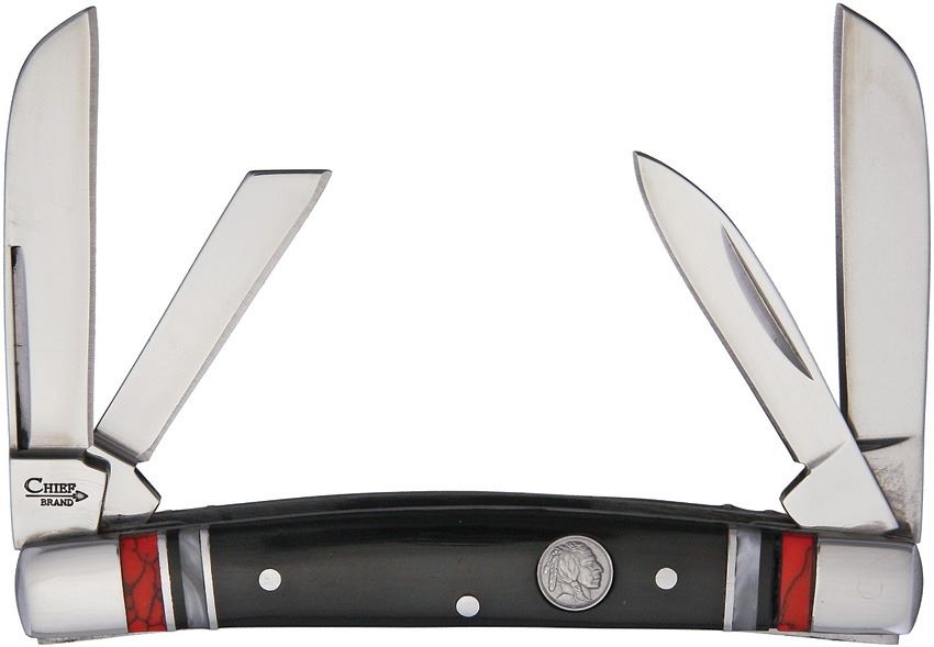 Congress - 3 5/8" closed. Stainless twin sheepsfoot, coping and pen blades. Black Delrin handles with nickel silver bolsters and Chief inlay shield.