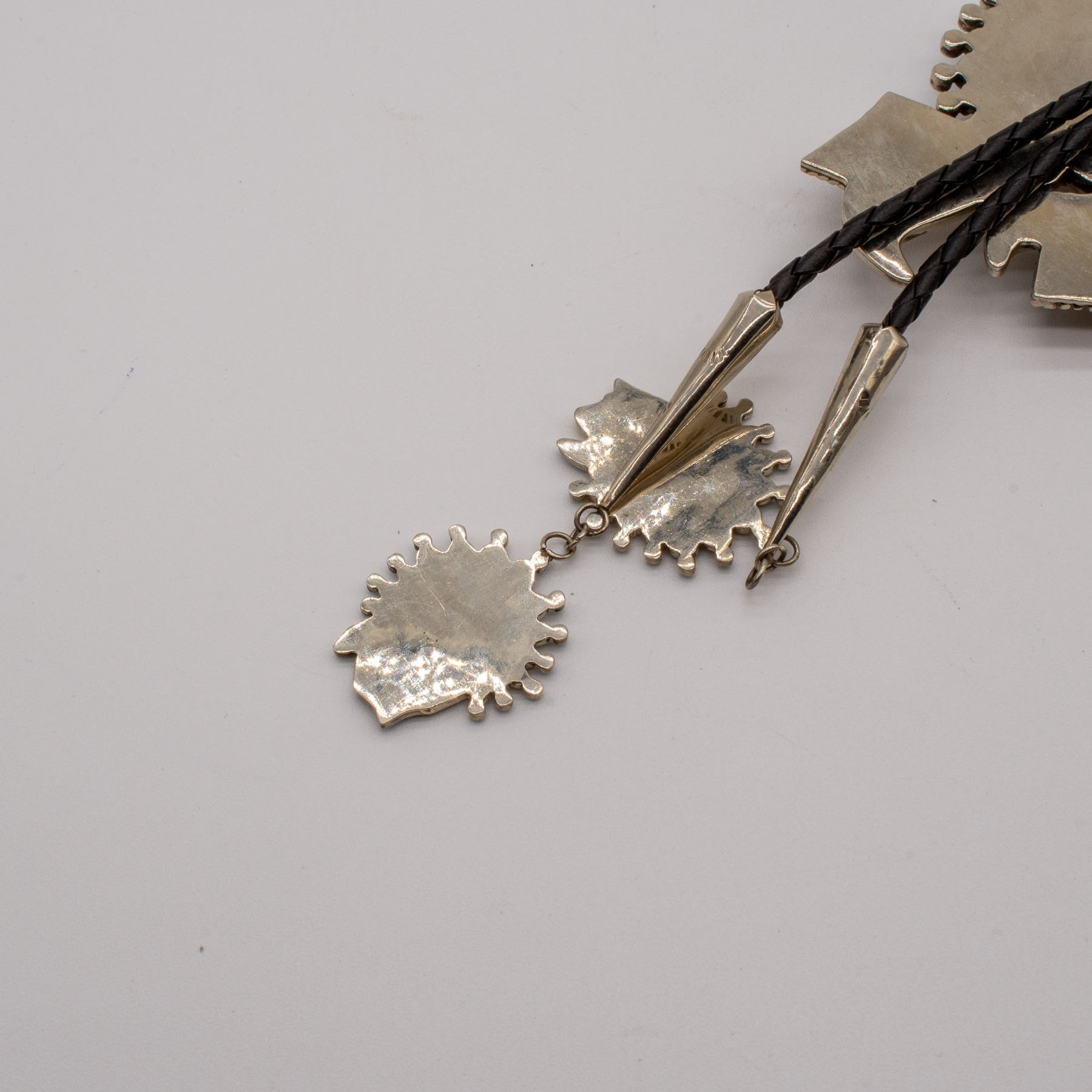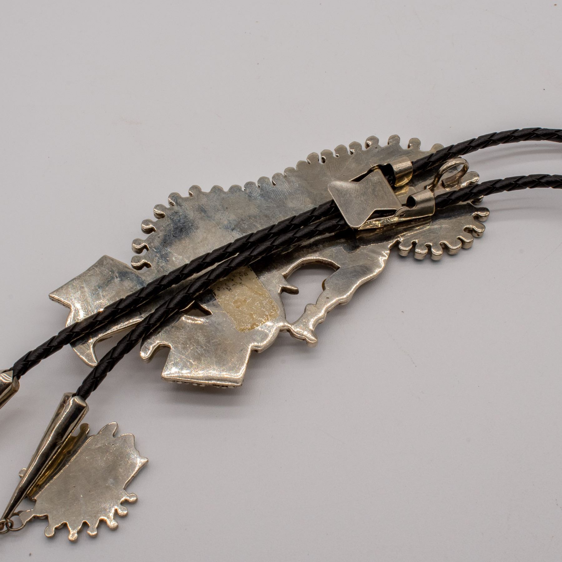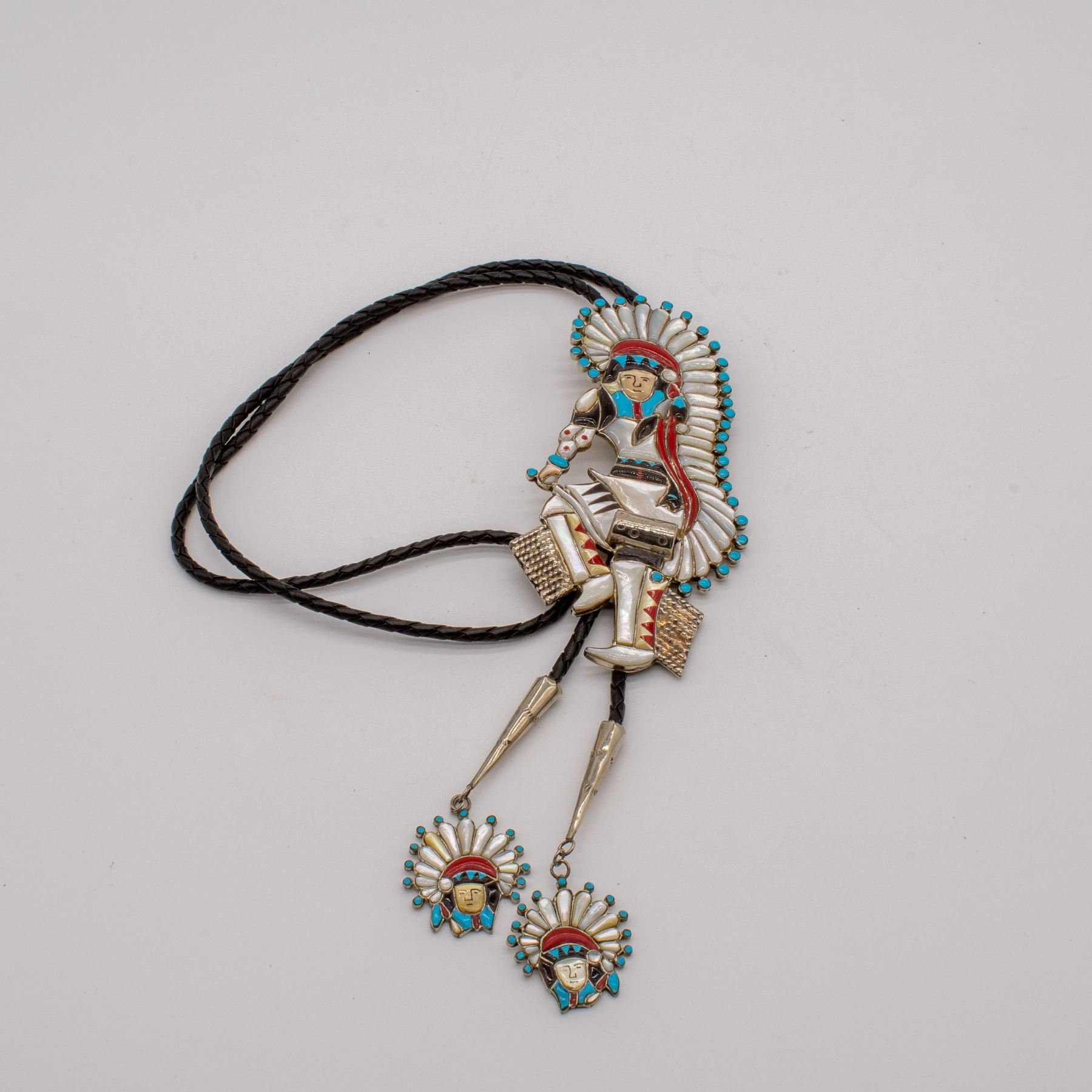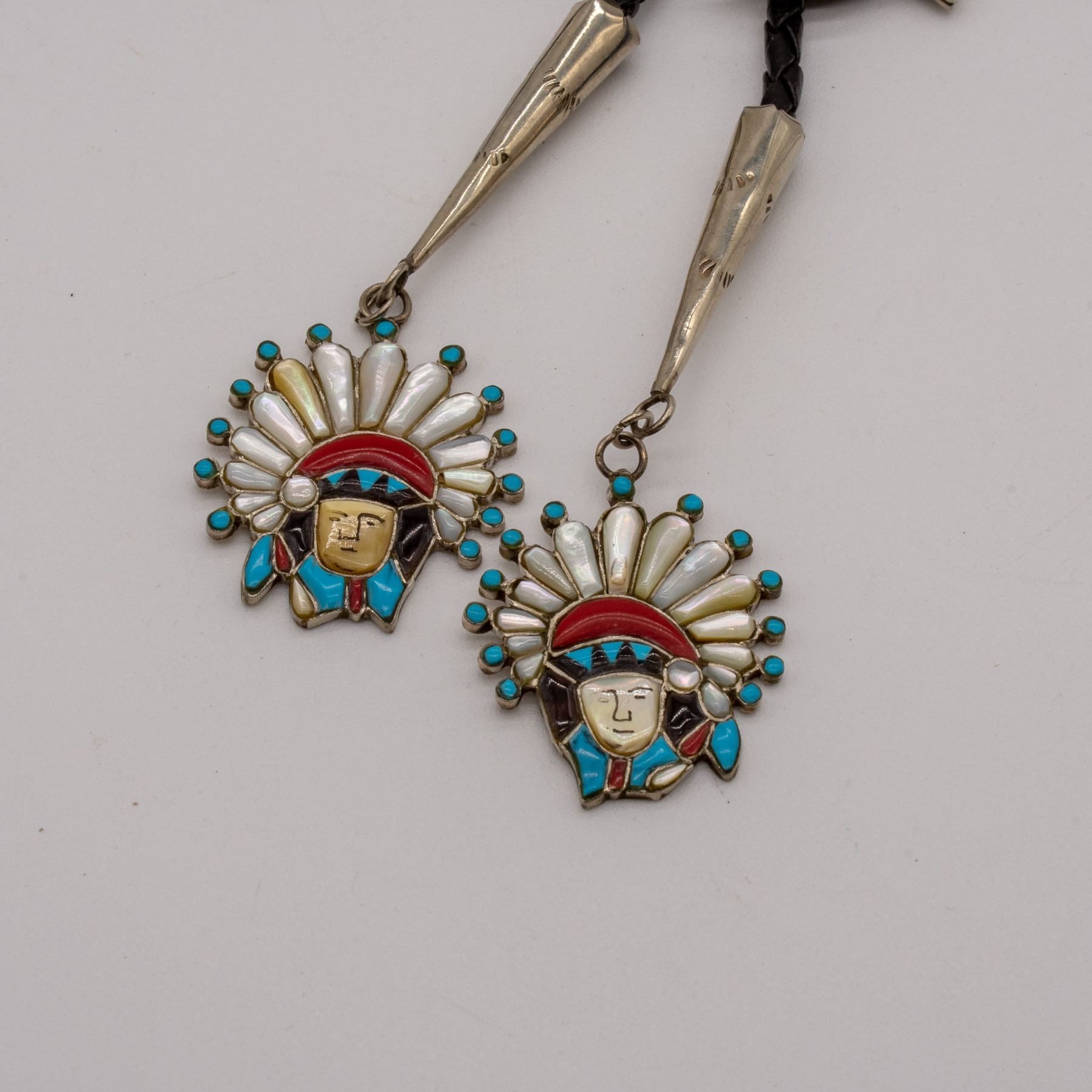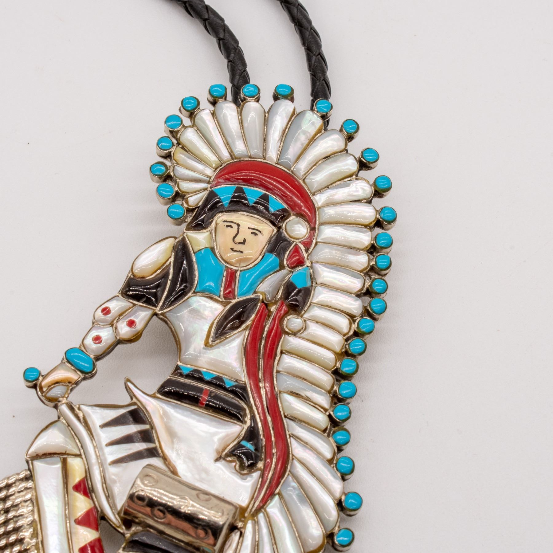 Chief Dancer Inlay Bolo Tie Pendant, slide measures 5''L x 2.5''W, inlay includes mother of pearl, turquoise, jet, and coral, chief head aglets, slide can be worn as a bolo tie or a pendant, please note that this is not Native American made nor is it sterling, but nonetheless a beautiful bold bolo tie, proceeds from the sale of this piece will go to a NM high school scholarship fund