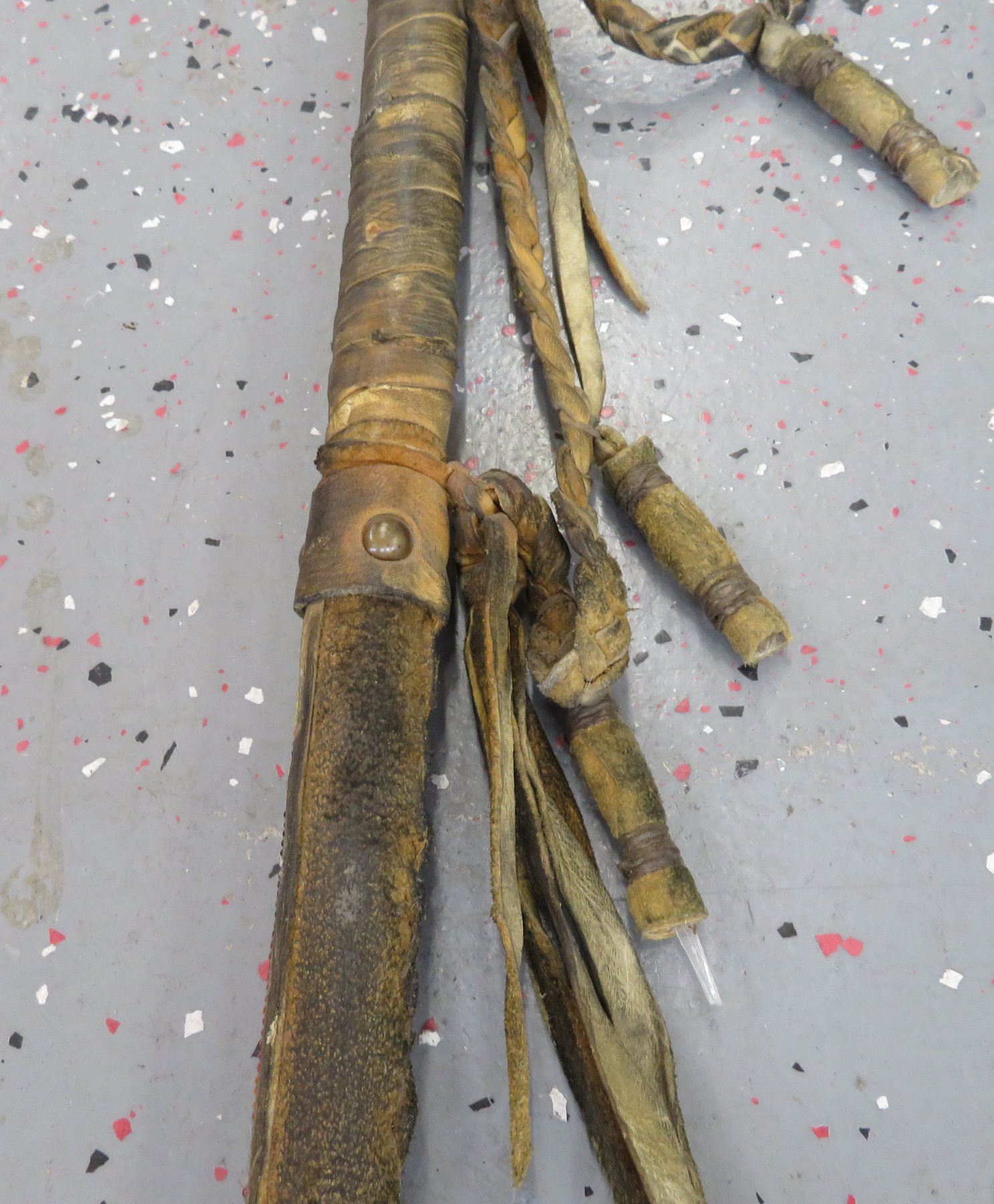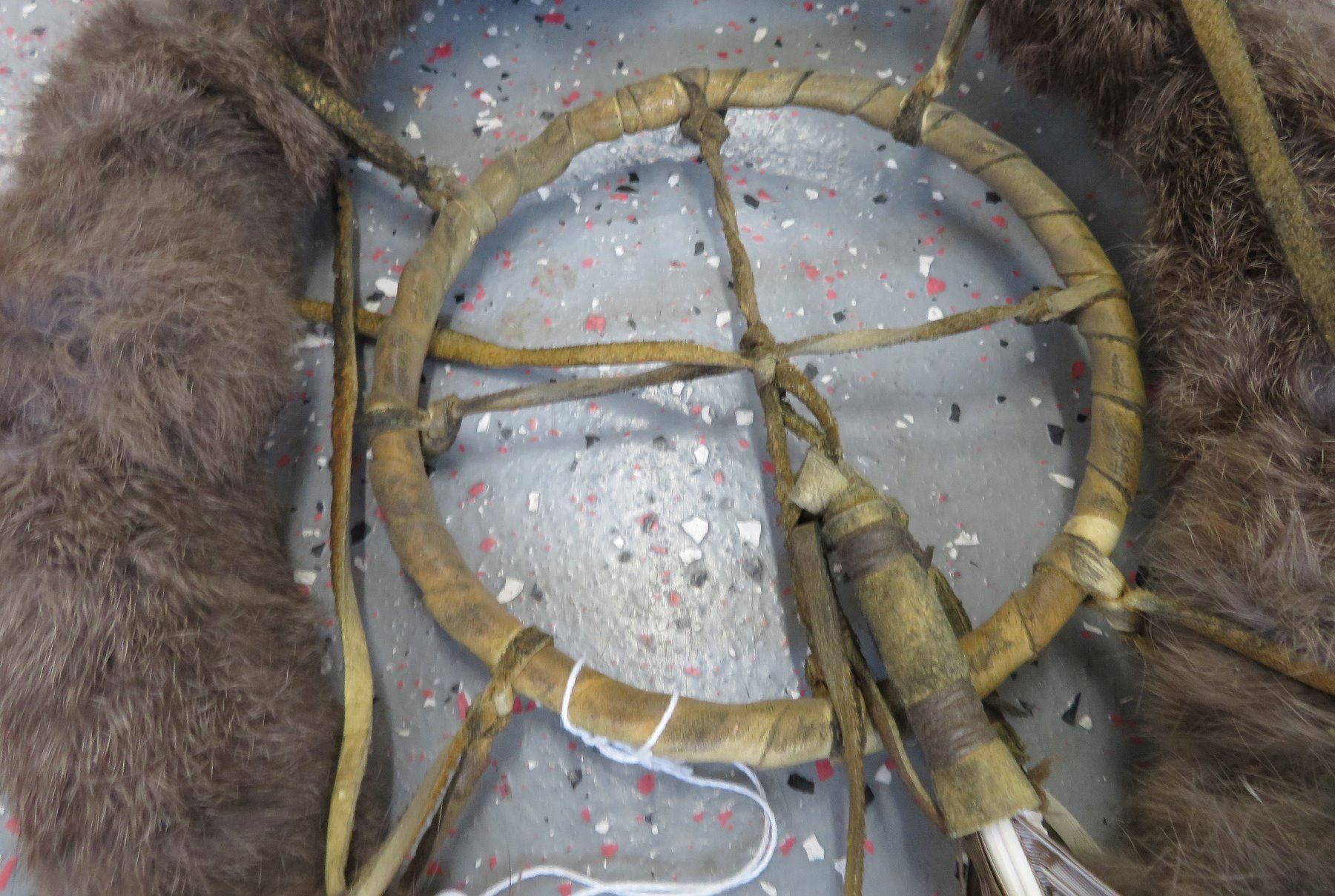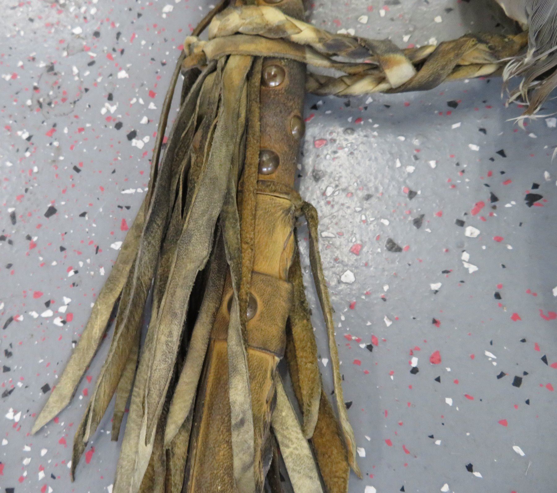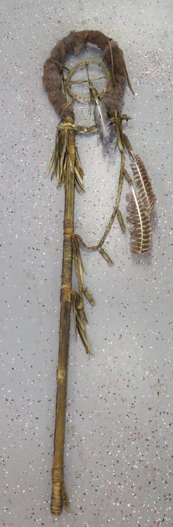 Chief Joseph-style Staff, c. 1940s. Made of feathers, wood, leather and beads, the item measures 60" x 10" x 1 1/2". Northern Plains. Well-used staff. Condition: Wear from heavy use, some stains, see images. Shipping: $75.00 USA estimate only, due to size, weight and value.