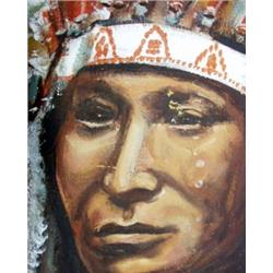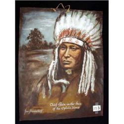 18" by 14" Painting of Chief Rain-in-the-Face, of the Ogala Sioux by Jan Brinkerhoff, a Garrett, IN artist. Painted on faux leather with some damage to the face.
