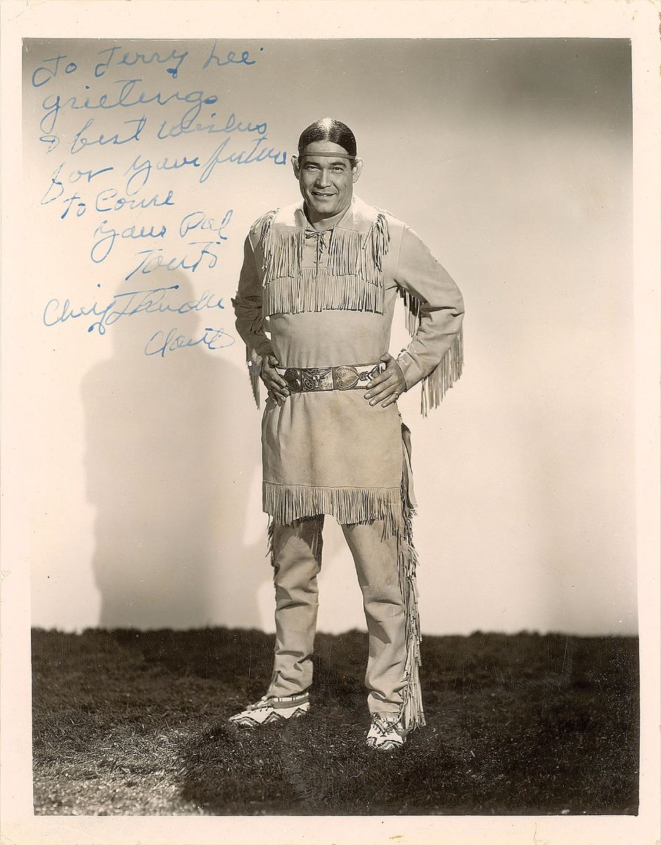 Character actor in westerns born Victor Daniels (1899–1955) who played the original Tonto in both Republic Lone Ranger serials. Vintage glossy 8 x 10.25 full-length photo of Chief Thundercloud in moccasin-style clothing, signed and inscribed in blue ink, “To Jerry Lee, grietings [sic] & best wishes for your future to come, your pal, Tonto, Chief Thunder Cloud.” In very good condition, with silvering to darker areas and scattered areas of surface rubbing.