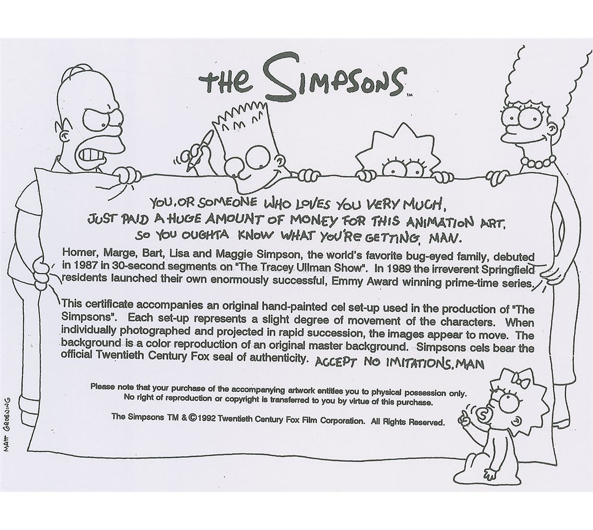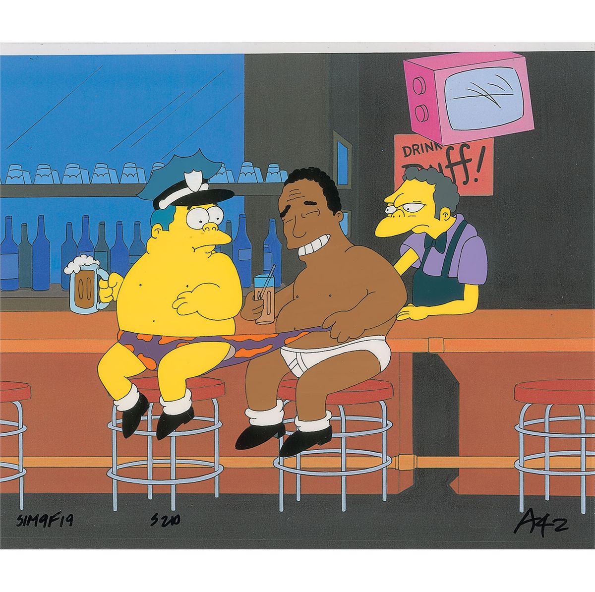 (20th Century Fox, 1993) Original production cel featuring Chief Wiggum, Dr. Hibbert, and Moe from The Simpsons episode ‘Krusty Gets Kancelled,’ showing the three characters sitting together at the bar. The cel is placed on a matching studio copy background. Image measures 9 x 6.5, with overall dimensions of 12.5 x 10.5. 20th Century Fox COA included. In fine condition.