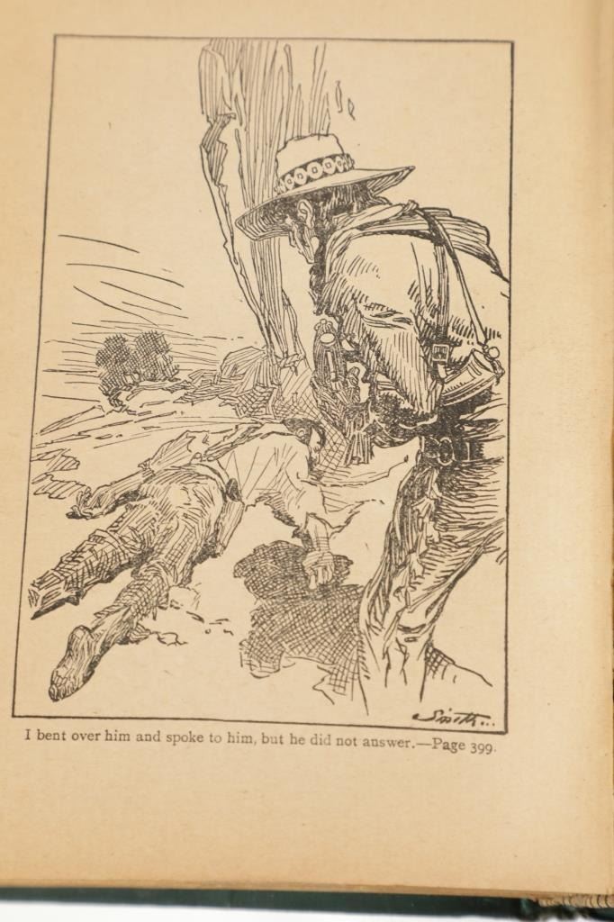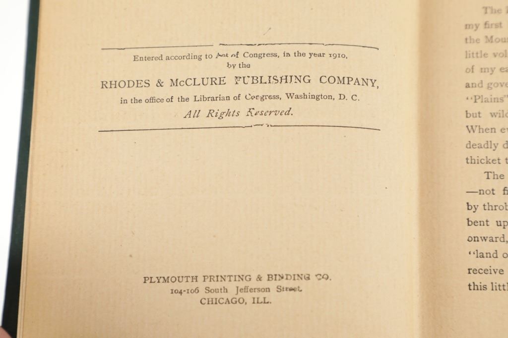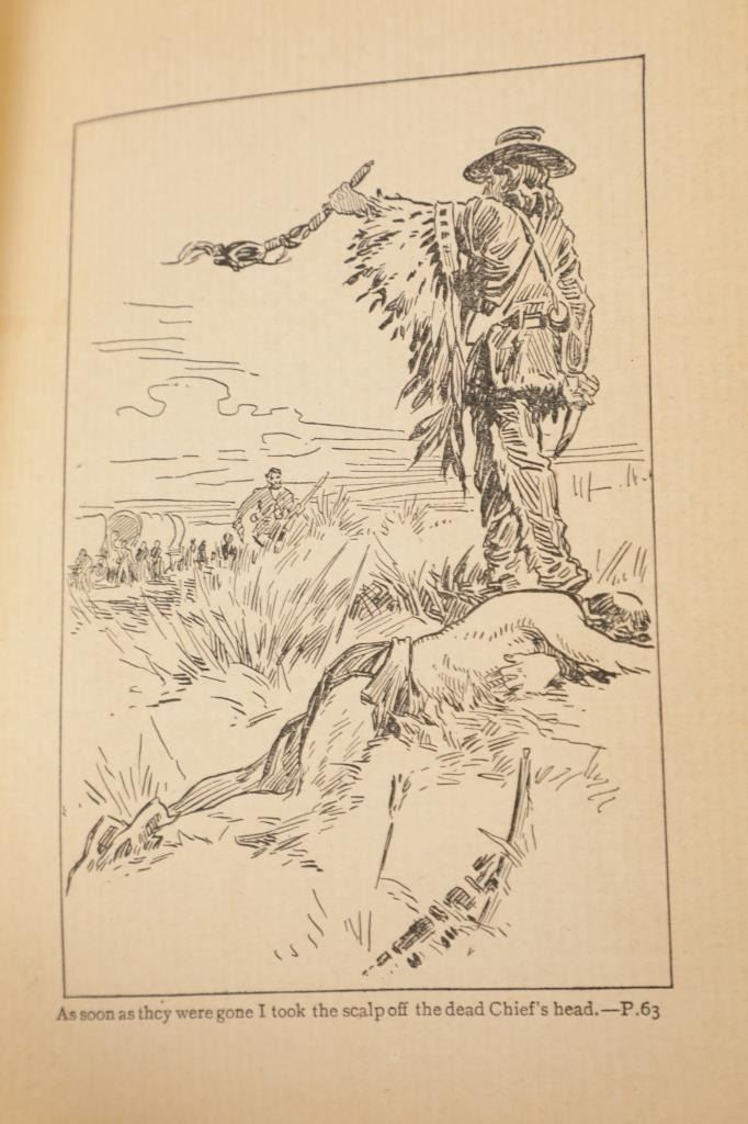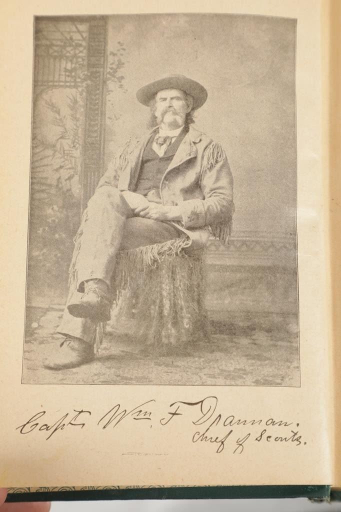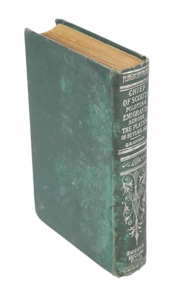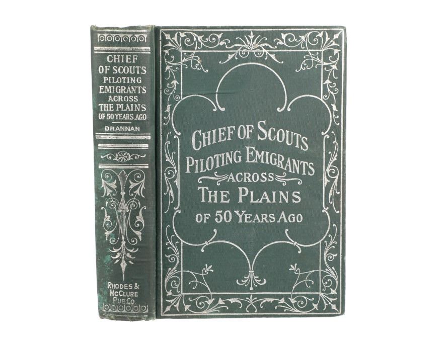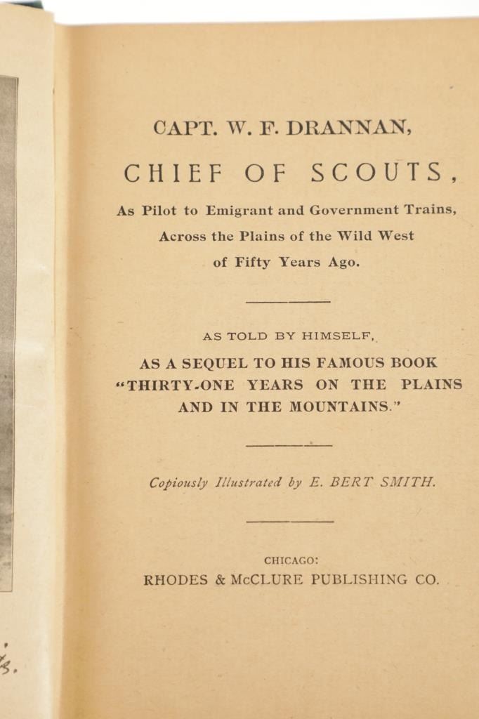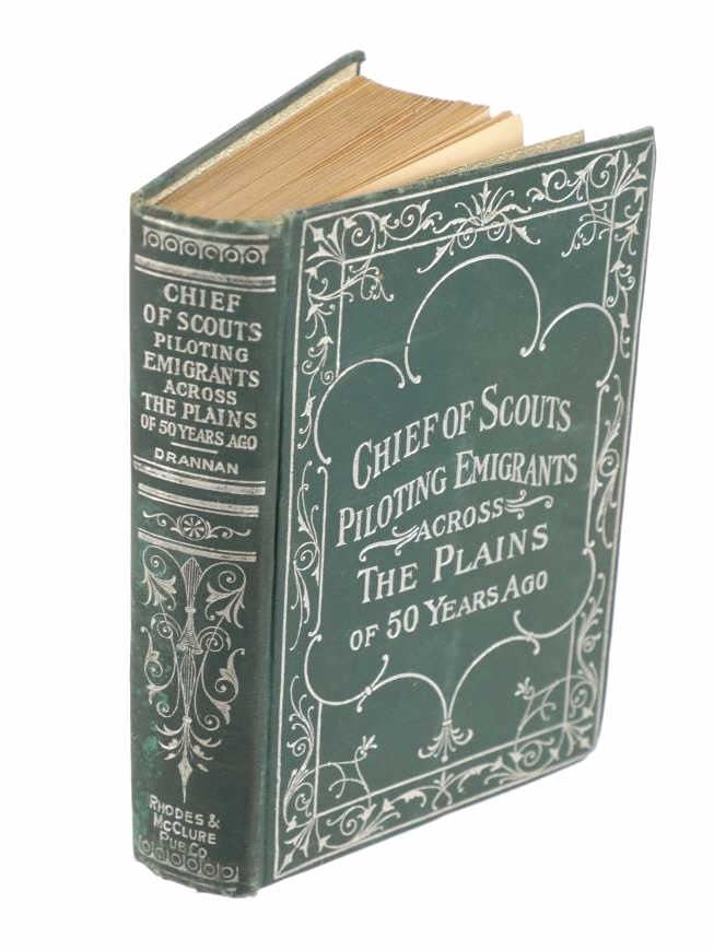 Featured for sale in this lot is a 1st Edition of, “Chief of Scouts - Piloting Emigrants Across the Plains of 50 Years Ago” written by Capt. W.F. Drannan and published by Rhodes & McClure Publishing Company in 1910. The book is "Copiously illustrated" by E. Bert Smith. The book is a sequel to Drannan's book, "Thirty-One Years on the Plains and in the Mountains". This is an autobiography of a Scout Captain William F. Drannan in which he has tried to portray that part of his earlier life which was spent in piloting emigrant and government trains across the Western Plains. This narrative gives you a fresh look at early pioneer travels across the west and the smarts that men, like Mr. Drannan, acquired when dealing with those hostile and tough new lands. According to two books that Drannan wrote he was a contemporary and brother-in-arms of such icons American icons as Kit Carson, Jim Bridger and General George Crook. The adventures he described having with these men were mostly of the heroic and hair-raising variety. The books helped satisfy the American public’s seemingly insatiable appetite for stories about a frontier that had been there not that long ago but wasn’t there any more at the turn of the century. Young boys were especially keen on the books, as they described a life full of adventure that was the fundamental stuff of their dreams.