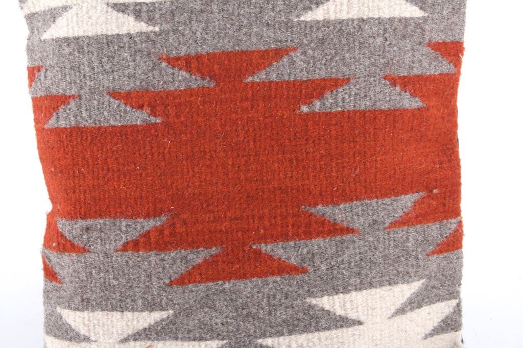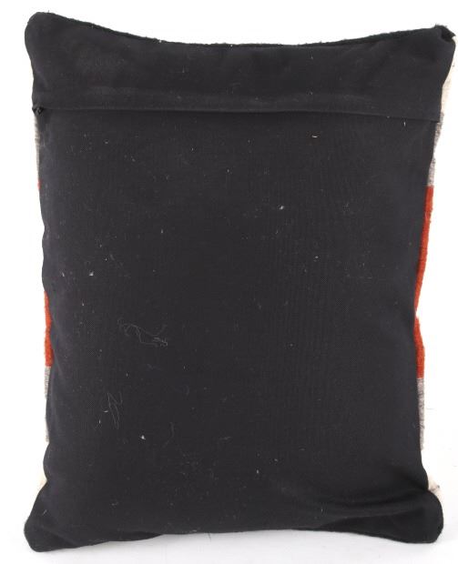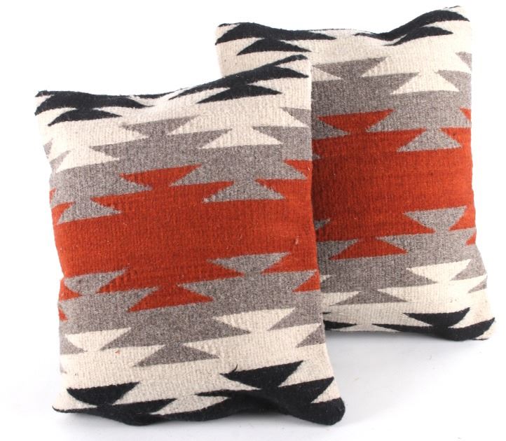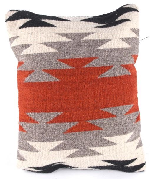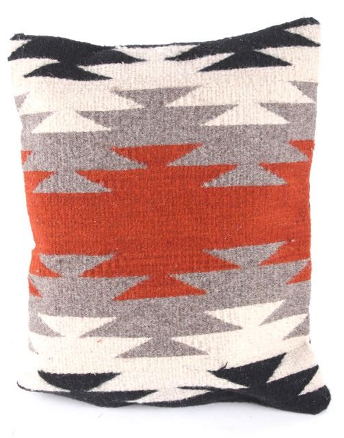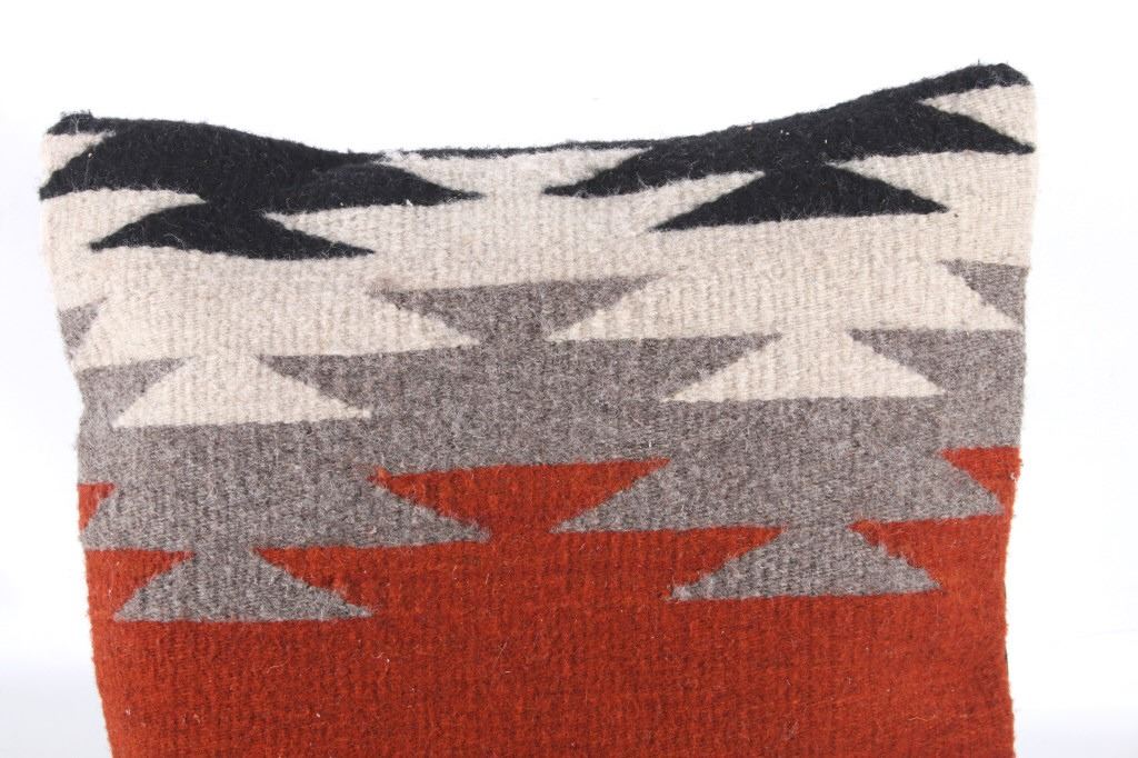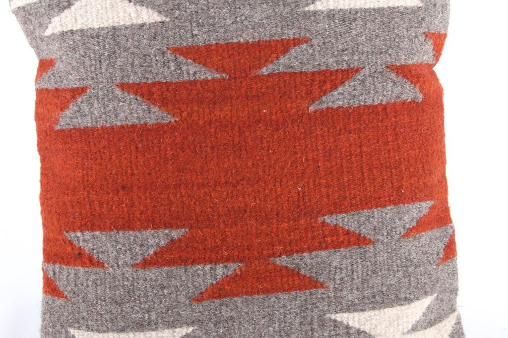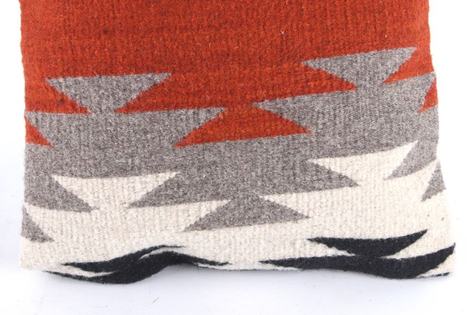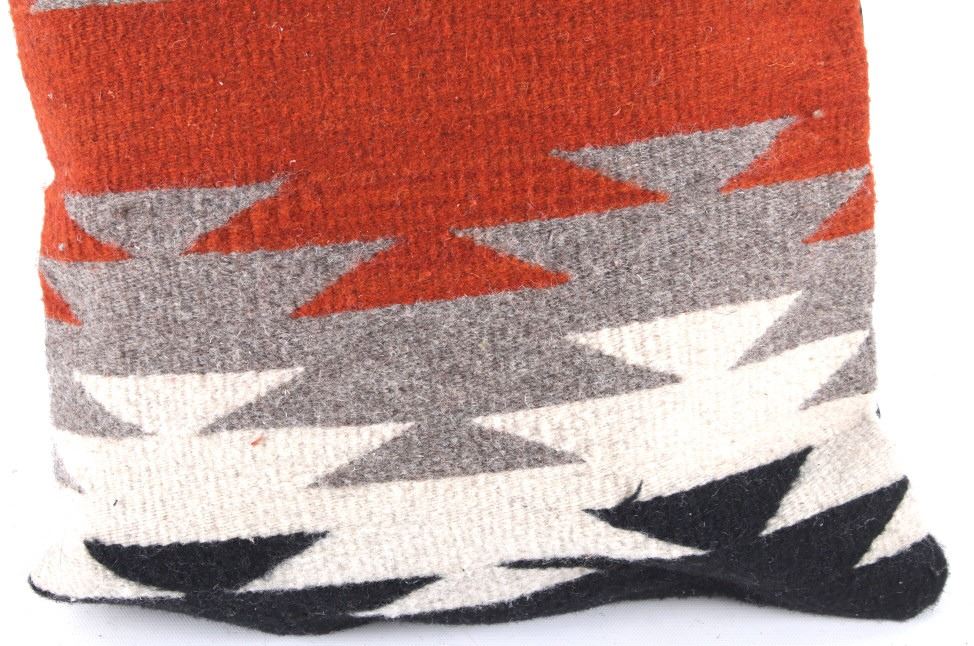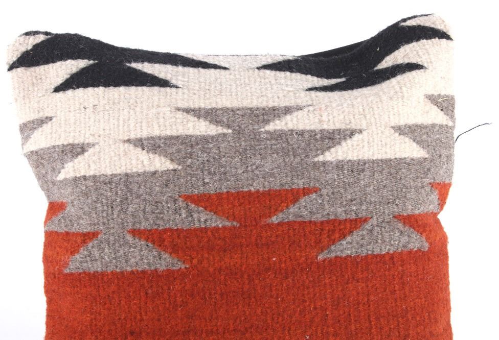 This is an excellent handwoven flat weave pillow set by master weaver Diego Ruiz using 100% soft fine Churro Wool yarns in a fantastic Third Phase Cross Chief’s Pattern. Churro wool is a time-tested fiber that is both strong and soft along with providing a vibrant base for rich colors. Tight handwoven weave showing bright rich colors in the bold Third Phase Chief’s Blanket pattern in the time-honored Zapotec multi-generational craft by a master weaver, Diego Ruiz. The piece is in brand new condition and is made with a pre-shrunk cotton backing with zipper. Comes with a pillow insert included. The pillows have an amazing Navajo Third Phase Trading Post styling by Zapotec weaver D. Ruiz showing a linear black, heather, grey, and red stripes with. The pillows are 14”x18” and are a stiff lumbar supportive pillow that is approximately 6.5” deep.