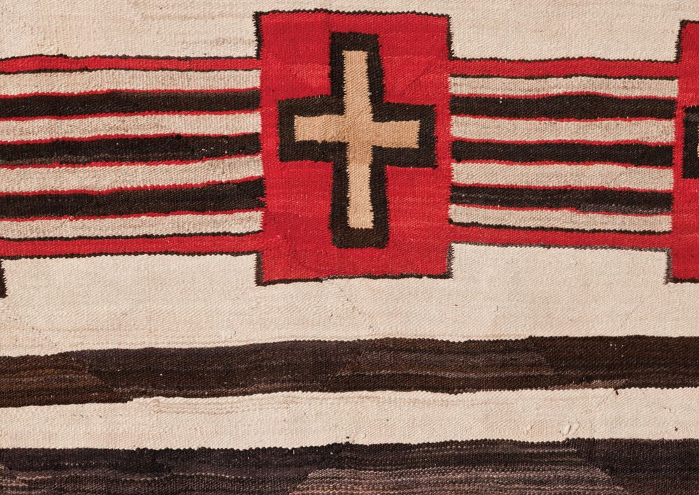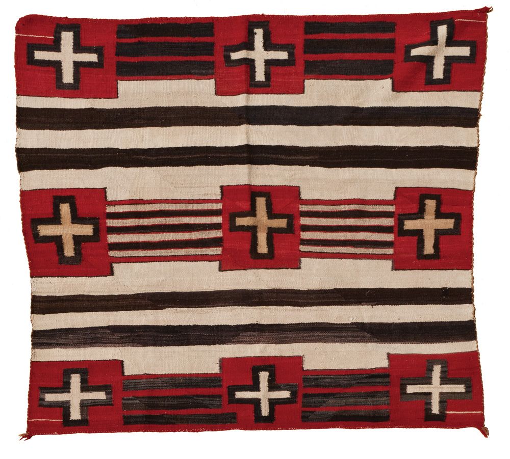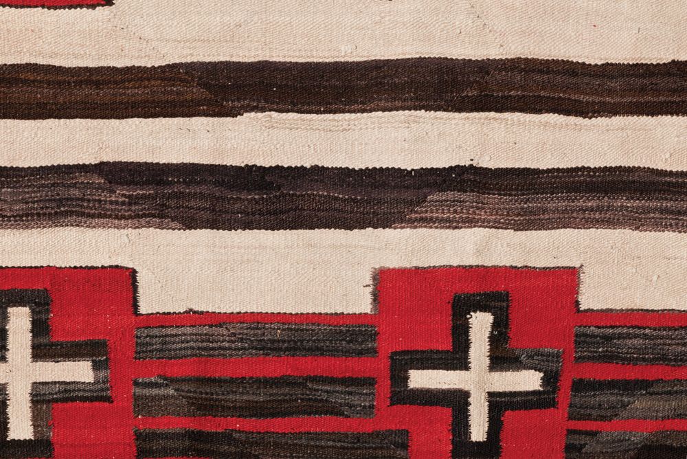 68” x 60” 2nd phase with horizontal solid bands of black and white with nine floating crosses and smaller black stripes on red field. Good condition, circa 1900.
