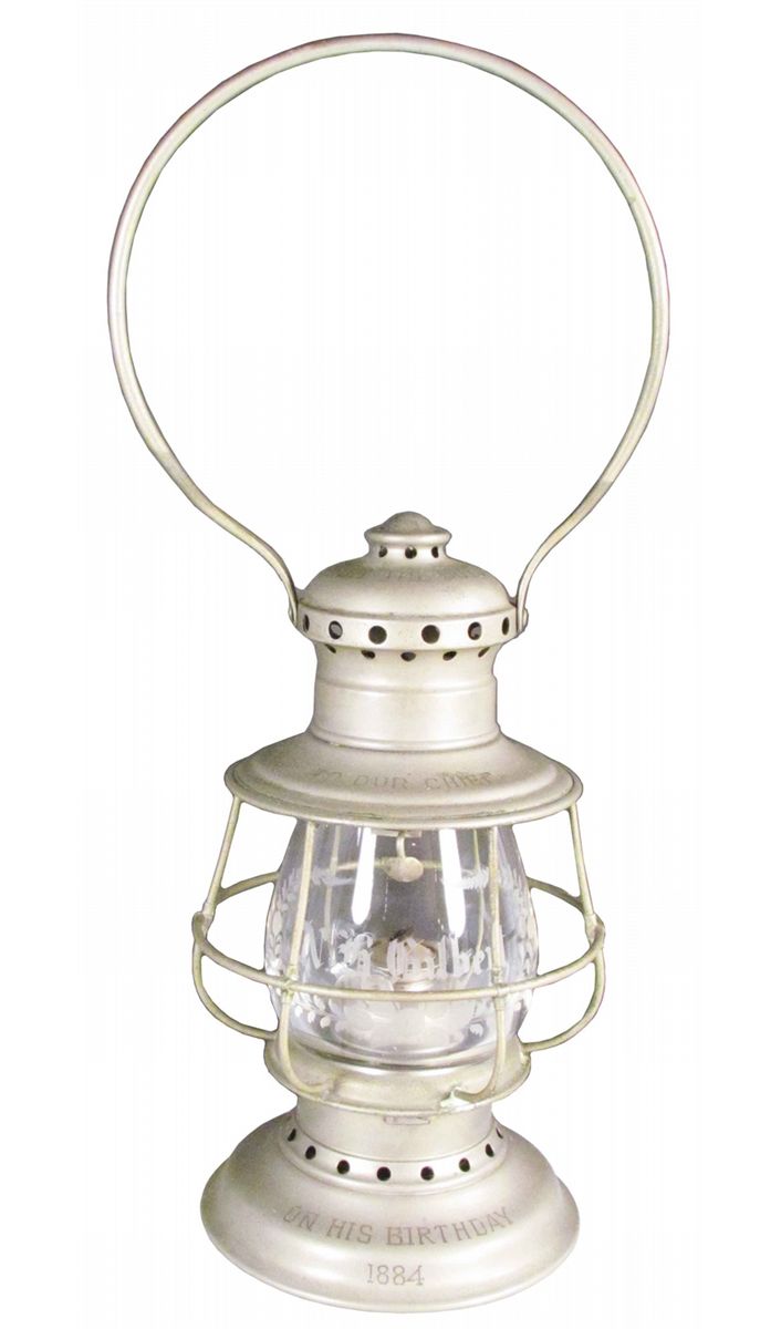 Chiefs Presentation Fire Lantern. Nickel over brass with etched glass globe and frame. "From the boys to our Chief on his birthday, 1884", N.H. Gilbert with wreath". Excellent condition.