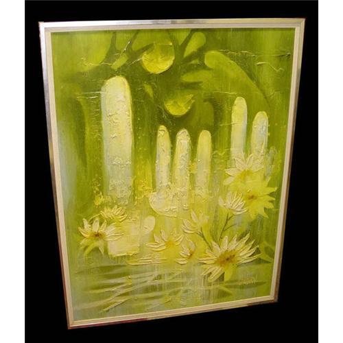 Signed -Chiehicov- lower right, colorful yellowish green surreal depiction of impasto flowers superimposed over a cactus like background acrylic on masonite painting, which would make a splendid addition to any modern household. Size: 42 x 32 inches.