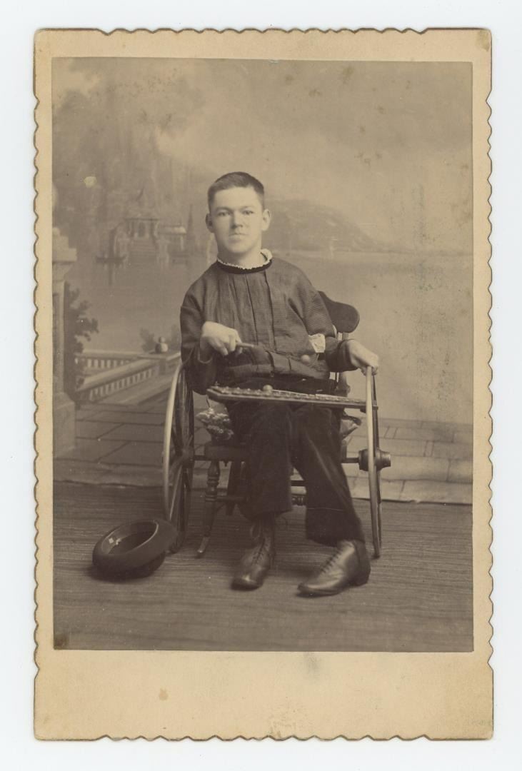 Child appears to have MS. There is a top hat on the ground, as he is playing the xylophone in front of a crowd. Frank Koons Traveling Photographer.