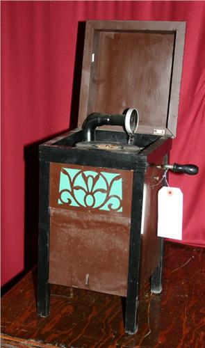 Phonograph in the style of an upright floor model. Sides and lid are metal on a wooden frame. Measures approximately 9" x 10" x 17 ½" high.