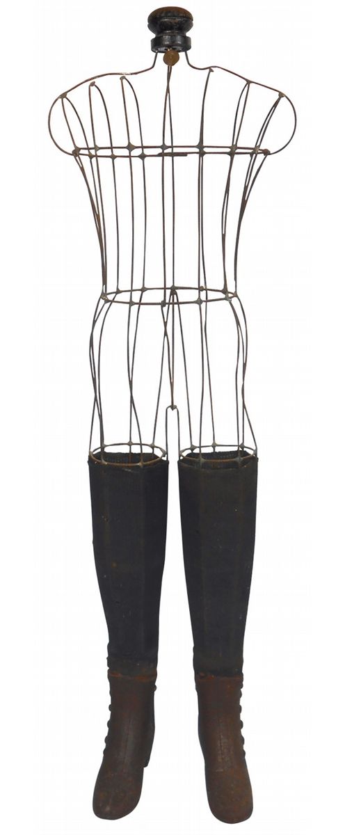 Child dress form, wire w/cast iron high-button shoes, orig fabric stockings, VG cond w/some separation at top & rust on shoes, 38"H.