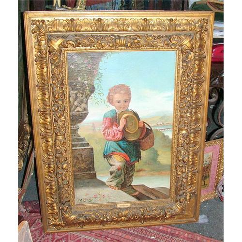 Beautiful Italian signed oil on canvas of a child, with outstanding quality frame, in very good conditions, standing without frame 29 inches H and 17 inches W , signed Corti.