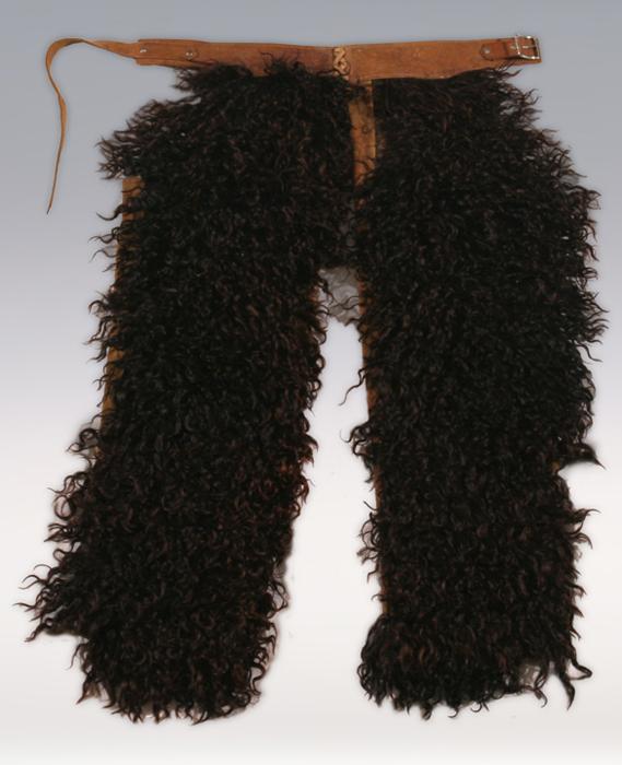 Child's Black Wooly Chaps. 34" long. Tooled belt. C. 1910. Luxurious long hair with only minor losses. Condition Report: Leather shows use on back. Hair has only very minor losses, generally excellent.