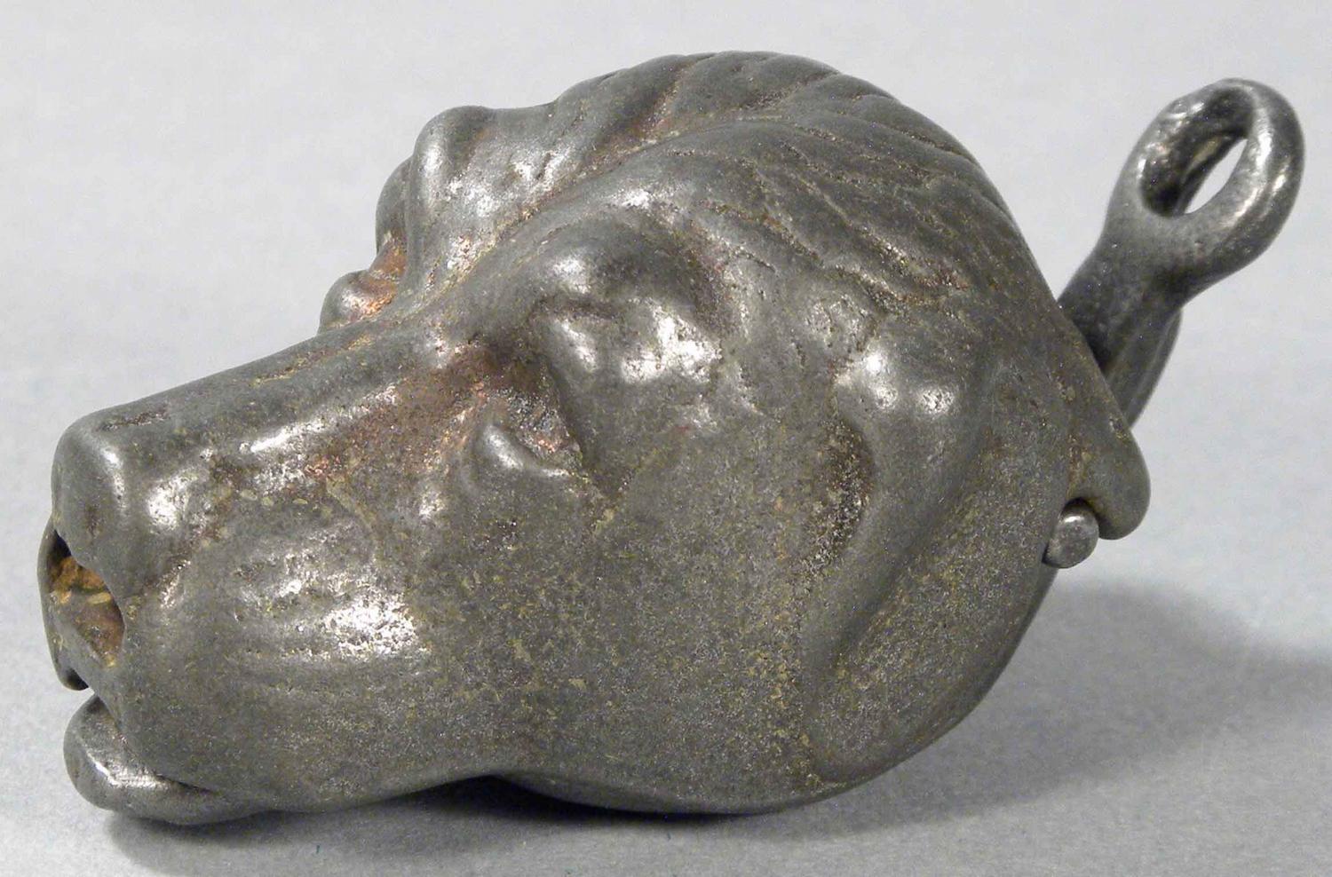 Child's Cap Bomb Toy. Cast iron in the shape of a dogs head, ca. 1900. Excellent condition. 1 X 2 X 1 inches. Starting bid $30