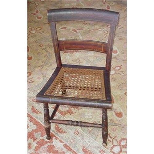 An early 19th century child's chair, 22" tall, 13 1/2" wide, 11" deep. Grain painted finish with caned seat ( damaged) Condition of finish is fair to good, loss to paint on legs. The seat can be repaired, in all it is a lovely little chair.