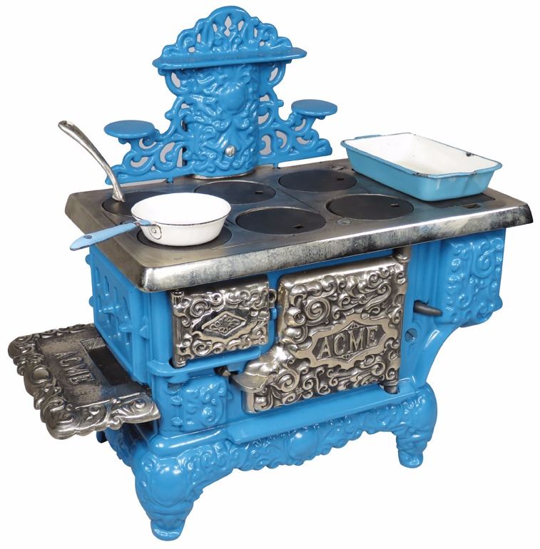 Turn of the Century Child's / Doll "Acme" Cook Stove. Blue enamel cast iron with nickle plated trim. Comes with accessories. Excellent condition. 13 1/2 X 12 1/2 X 7 inches.