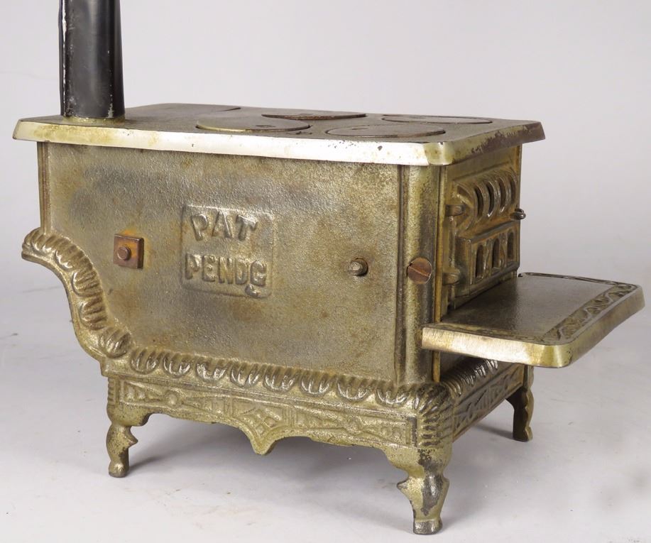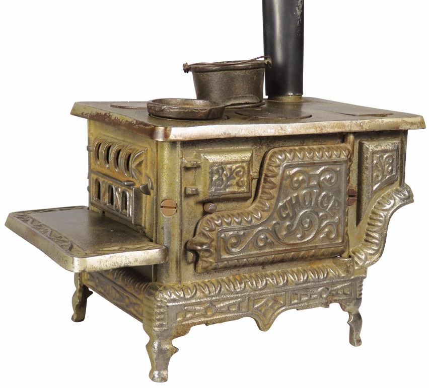 Turn of the Century Child's / Doll "Choice" Cook Stove. Worn nickel plated cast iron. Comes with accessories. Good condition. 8 X 5 X 4 1/2 inches.
