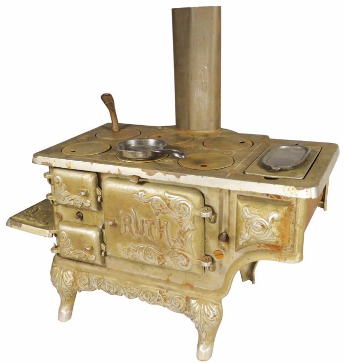 Late 1800's Child's / Doll "Ruth" Cook Stove. Worn nickel plated cast iron. Comes with accessories. 15 X 14 1/2 X 8 inches.