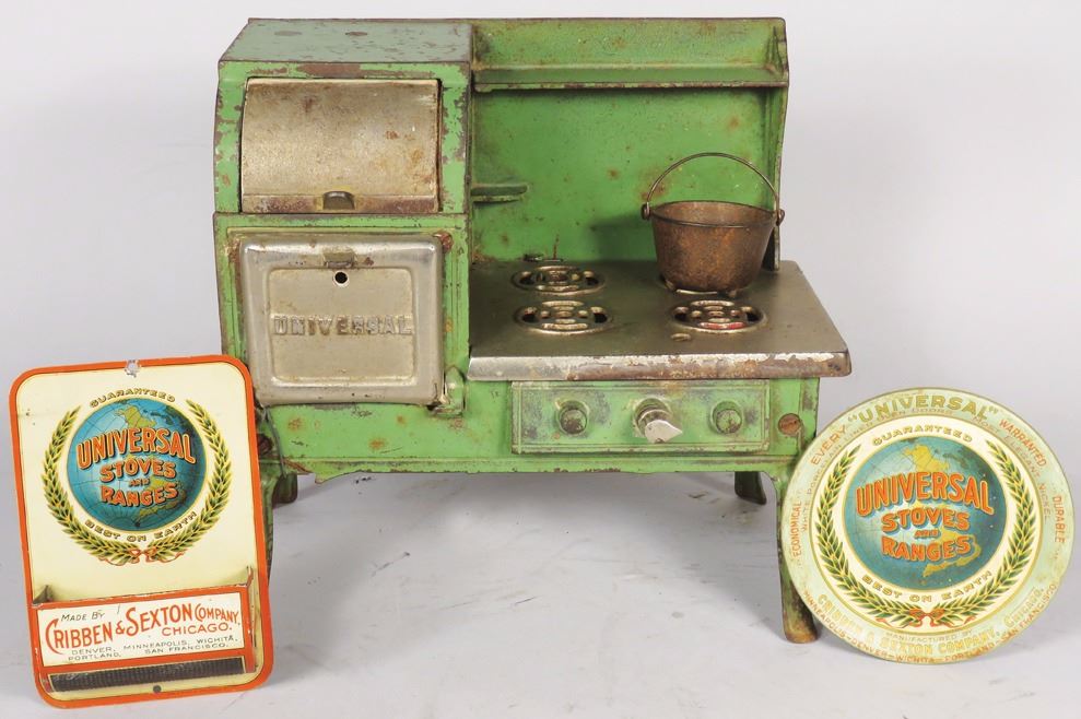 Child's / Doll Universal Cook Stove with Advertising Tip Tray and Tin Match Holder. Overall good condition. Stove measures 8 1/2 inches tall.