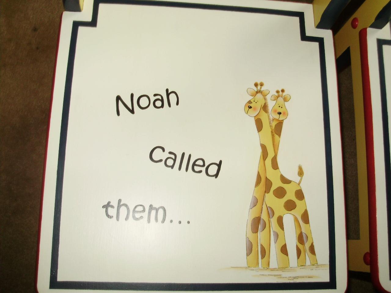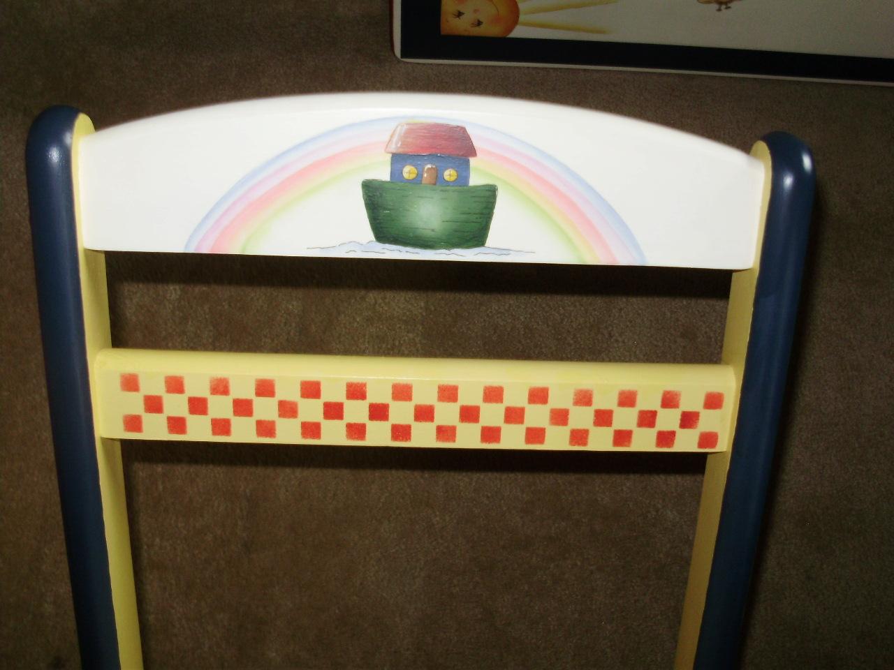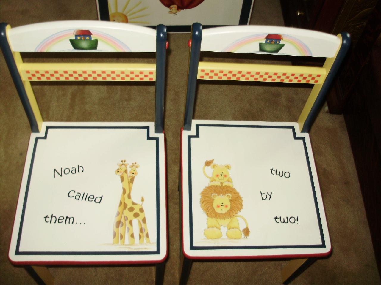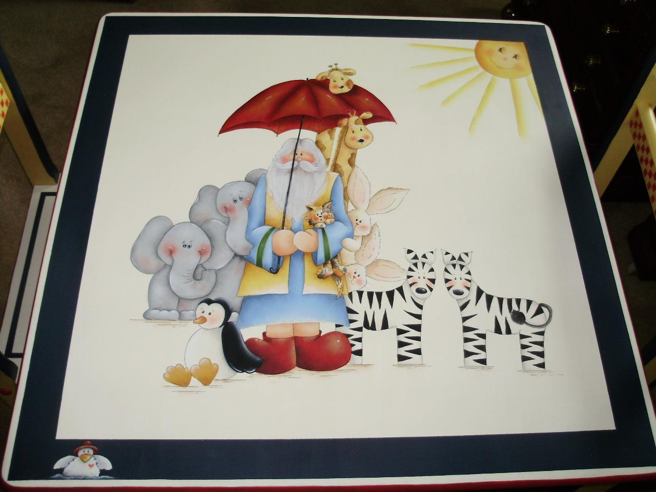 Fantastic One-of-a-Kind Painted Childrens Table and Chairs from Sho-Me Strokes Decorative Painters signed by the Artists, featuring Noah with his ark and the animals.