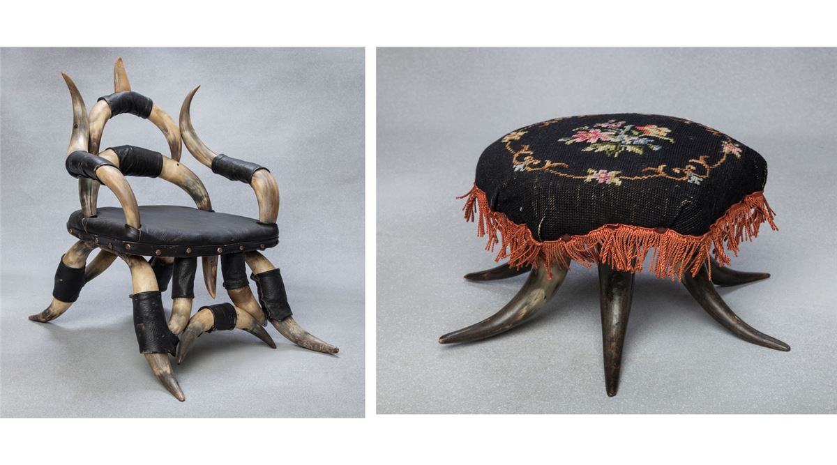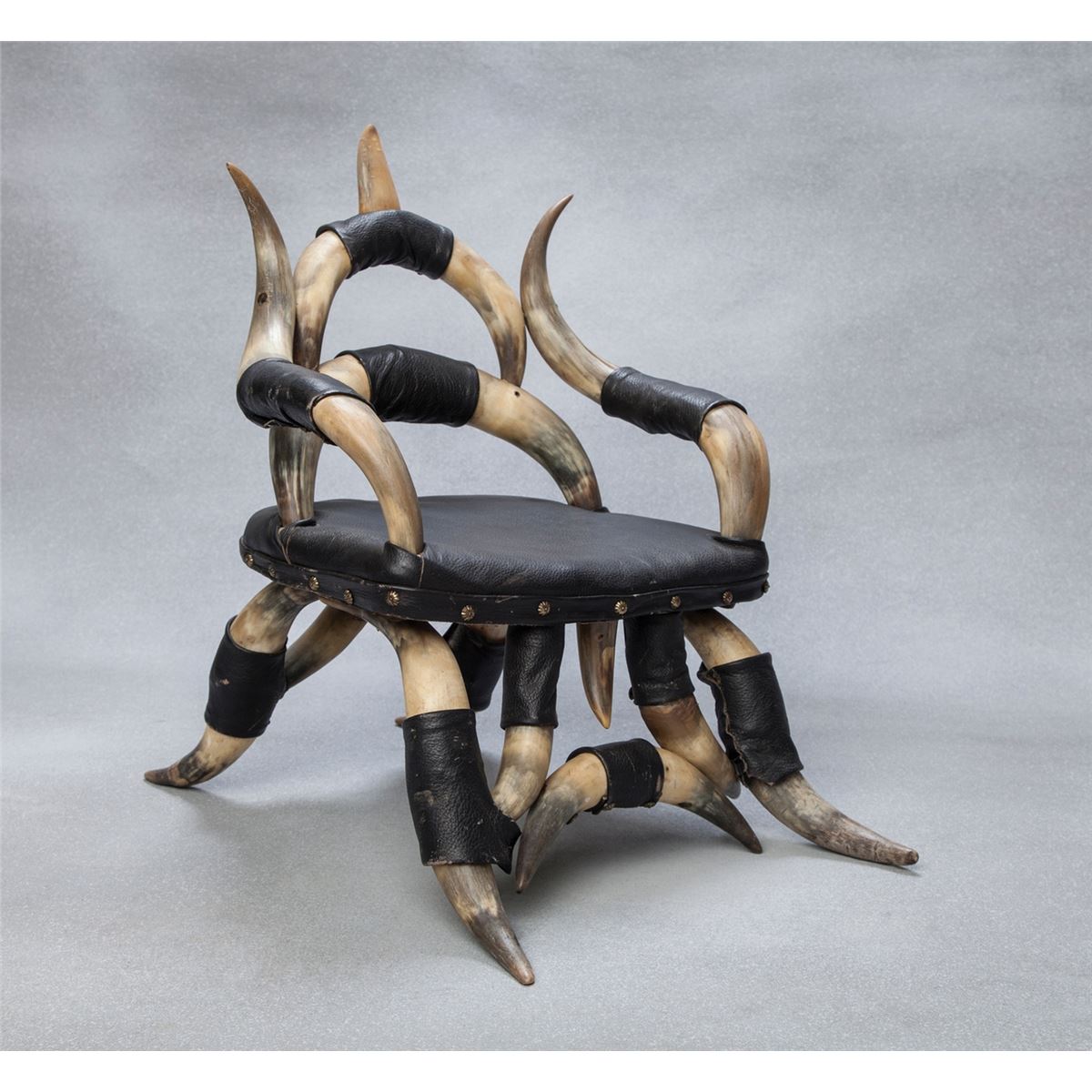 a) Stylish horn chair with black leather. More than 10 pairs of horns make up this kids’ chair. 23" tall by 17" wide and 16" deep.