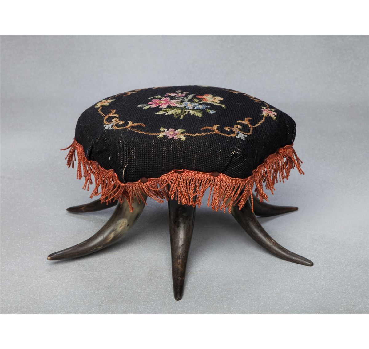 b) This footstool is made up of 6 horns for the feet with a 16" round, fabric-covered and fringed top.