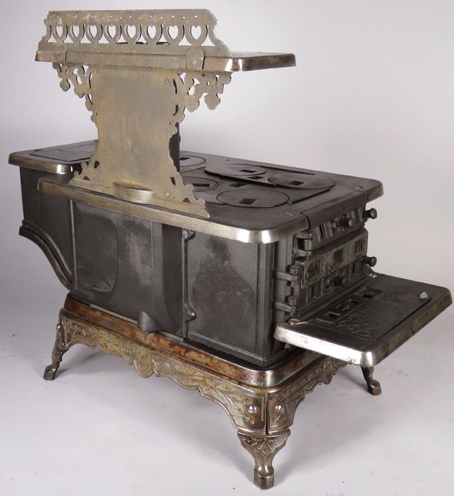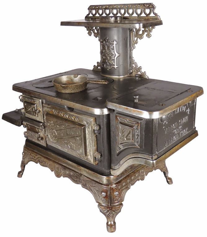Late 1800's Child's "Jewel Range Jr" Cook Stove made by Detroit Stove Works. Black cast iron with nickle plated trim. Comes with fry pan. Very good condition. 18 1/4 X 16 X 9 1/4 inches.