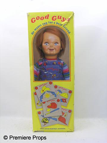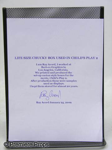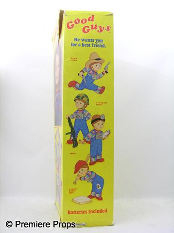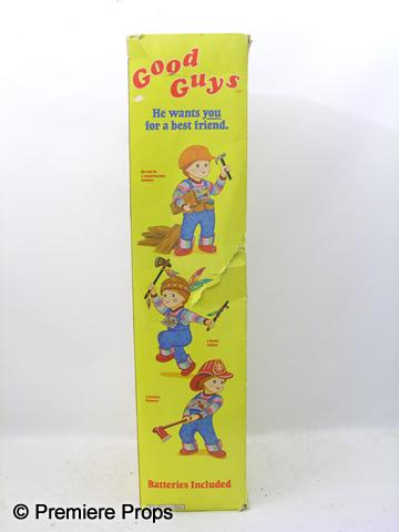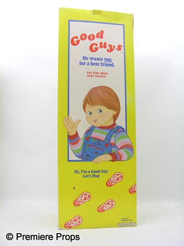 Child's Play 2 - Look out Jack! Chucky's back! From the set of the horror thriller, Child's Play 2, this a yellow, blue, red, and green multicolored cardboard "Good Guys" doll box. This is a screen used empty doll box that is slightly damaged and is approx. 35" tall. This box also includes an original Letter of Authenticity from Ray Accord who worked at Bert-co Graphics. The box appears on screen, behind them as Chucky lurks over Andy on the floor. This is one out of two of the only documented boxes ever sold.! This item will require additional shipping charges. Please email for shipping rates prior to bidding. (HD3007)
