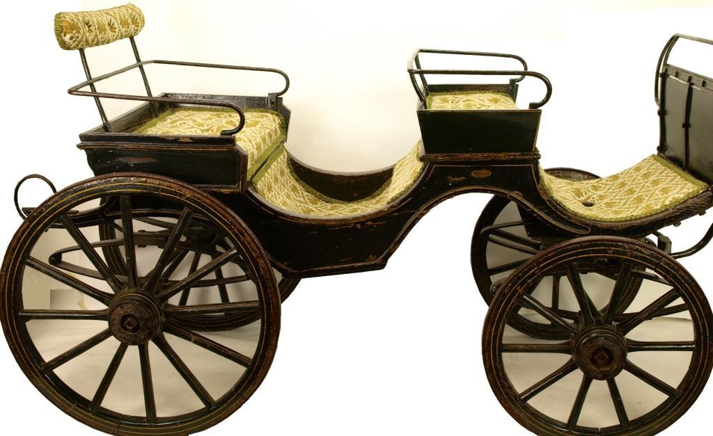 with wooden spoke wheels and iron rims, hand pin striped, re-upholstered with a brocade hand tufted fabric, paint appears original, very good overall condition, no tongue.