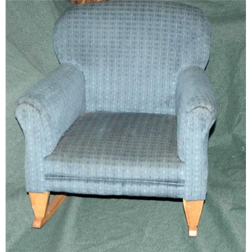 Cute fully upholstered child's rocking chair. The chair is quite old, probably from the 30's or 40's. It has been professionally reupholstered several years ago. It measures 18" x 20" x 24". <p> The condition is very good. It has been used gently over the last 10 years since it has had the new fabric put on. <p><p>