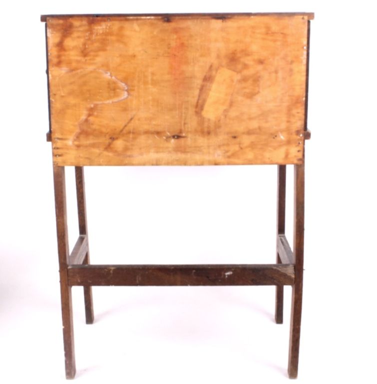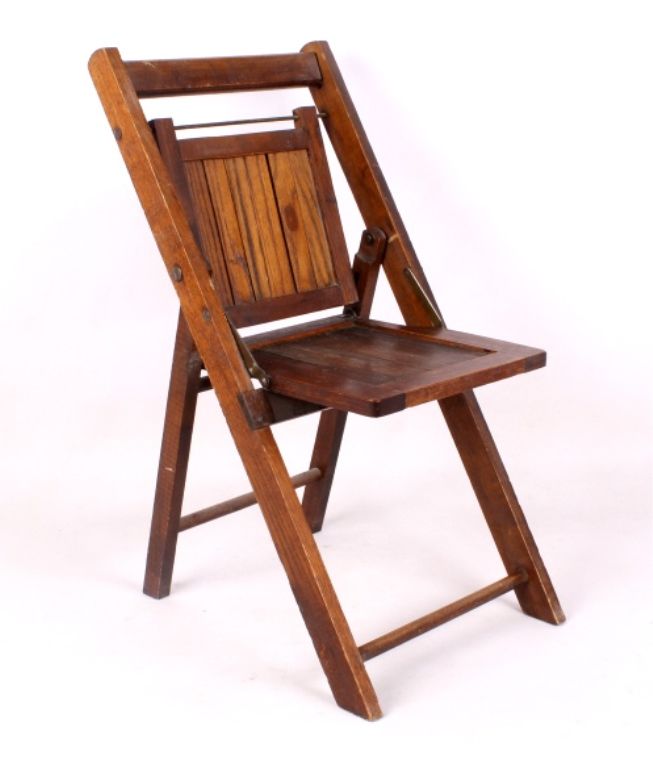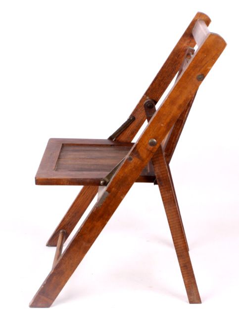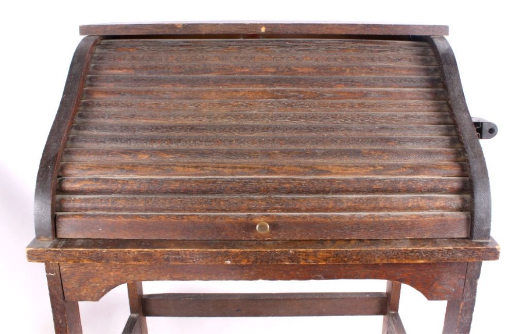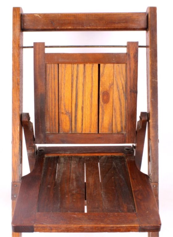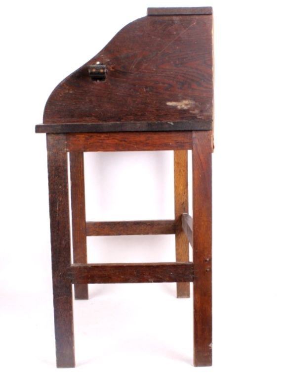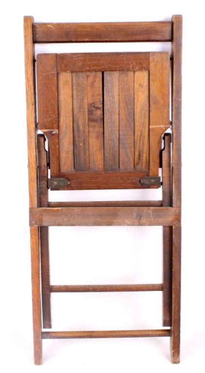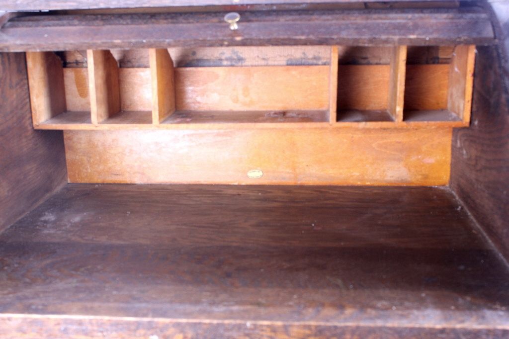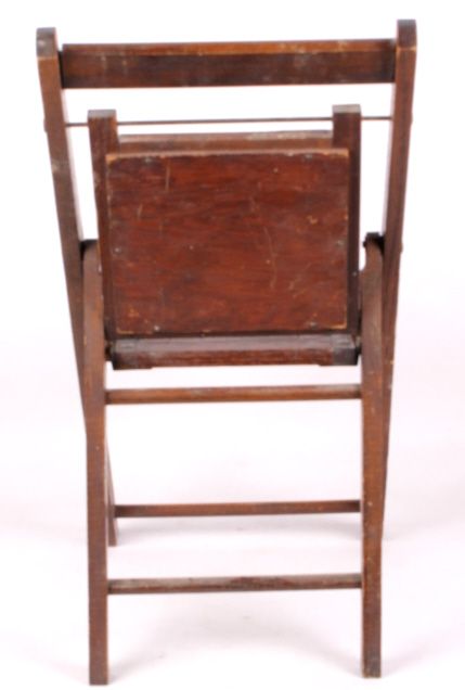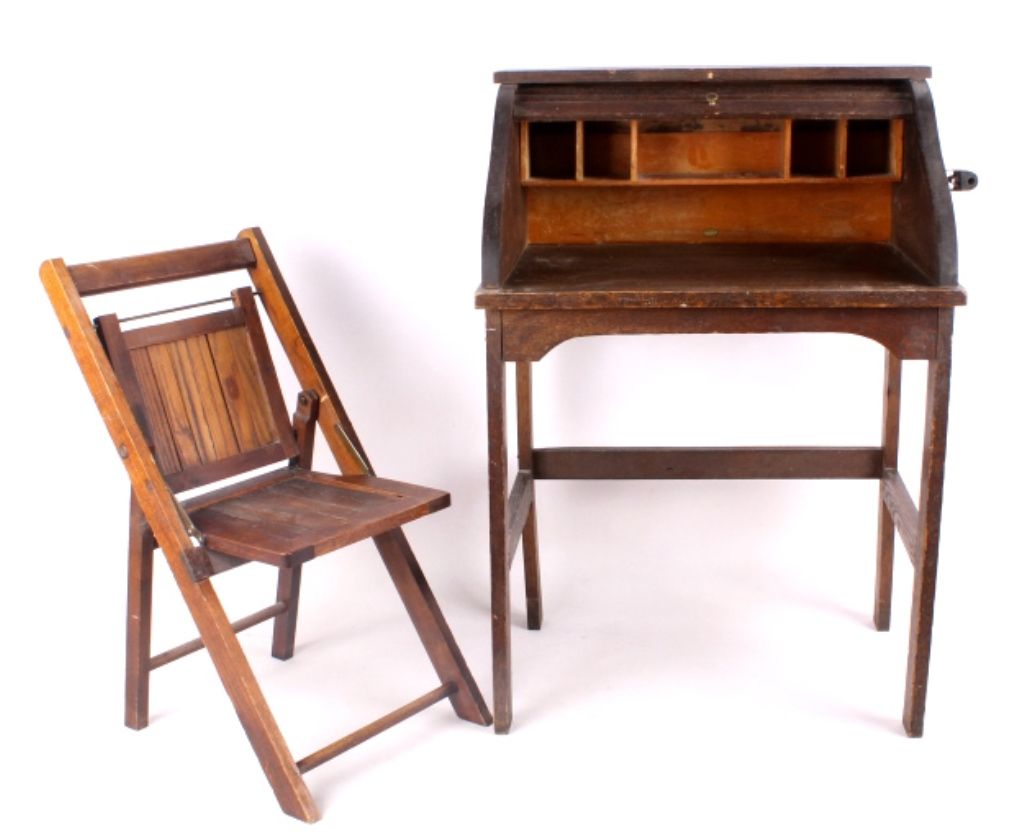 This lot features a child's roll top desk and folding wooden chair. Just like the full size desk, this scaled down version has a tambour door and pigeon holes inside. The desk measures 15" x 22" and is 32" tall. Thechair is 12" x 16" and 24" tall.