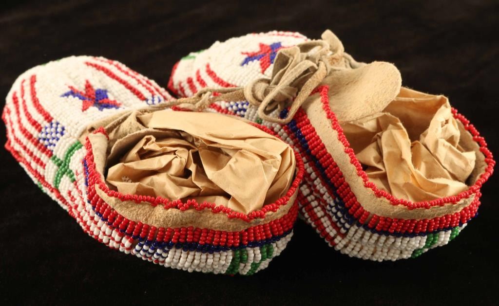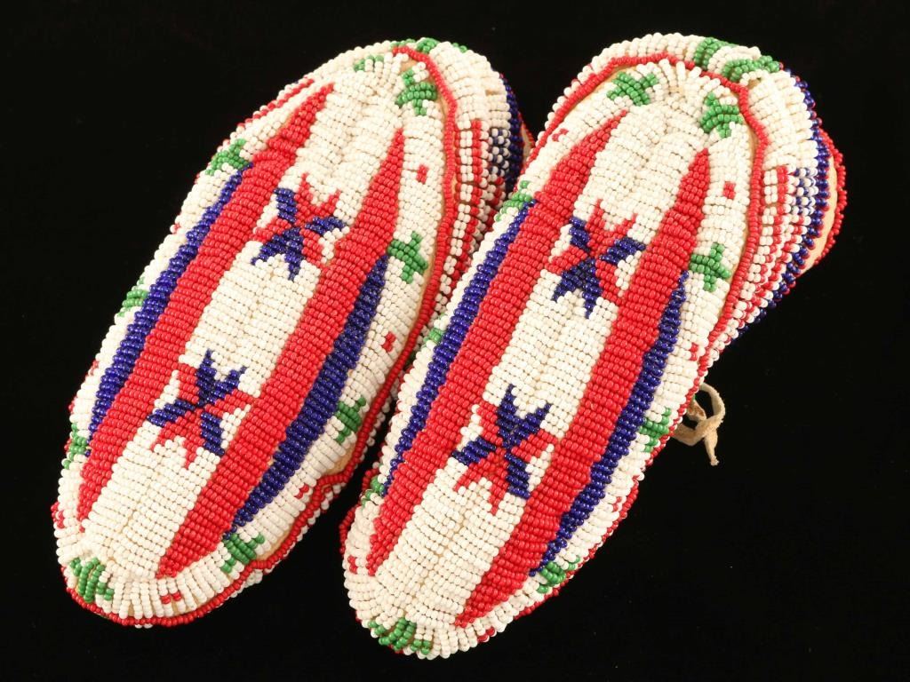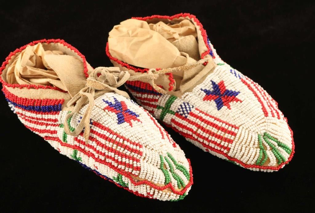 Fully beads moccasins with a flag and star motif in overall excellent condition.