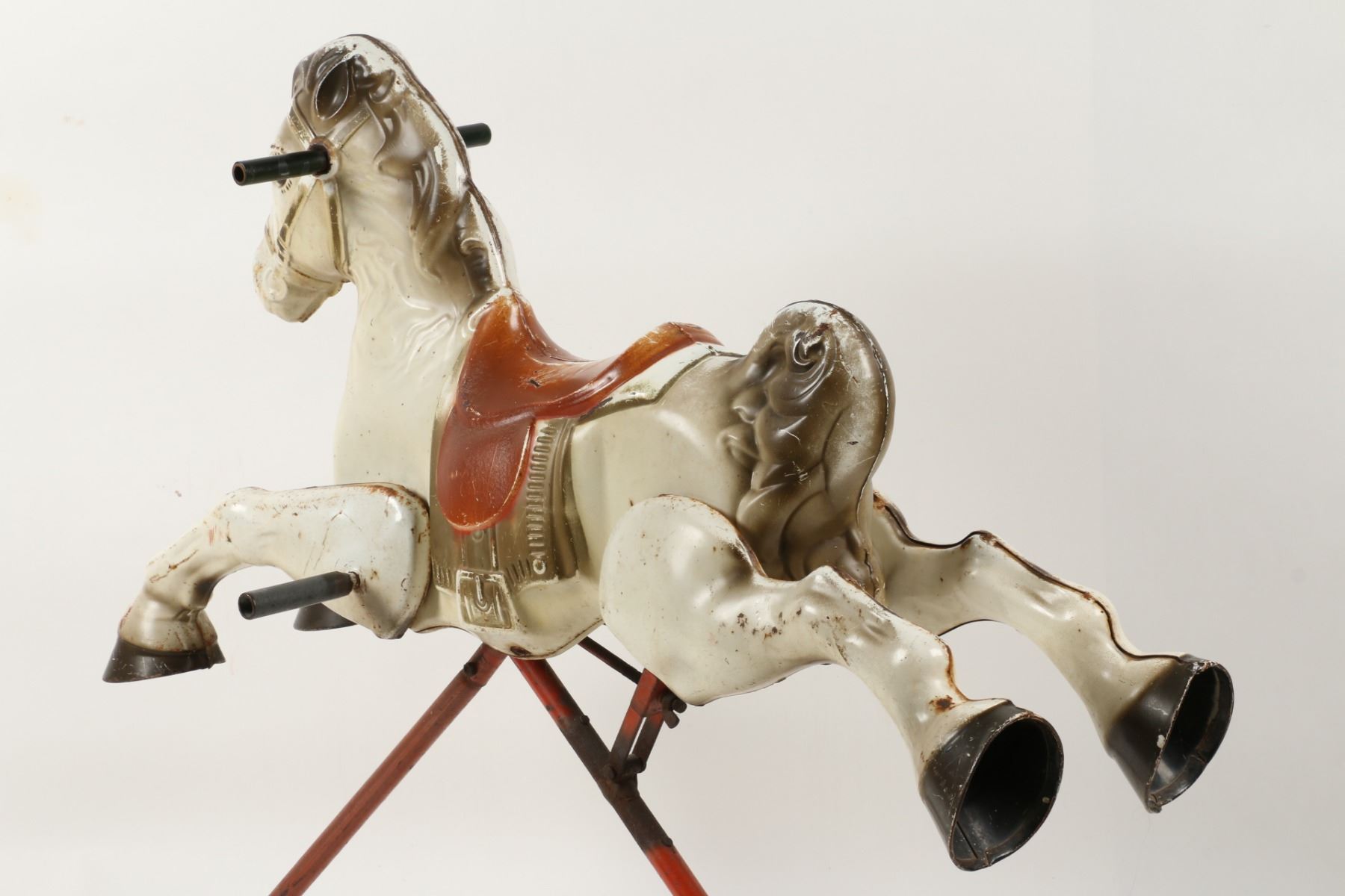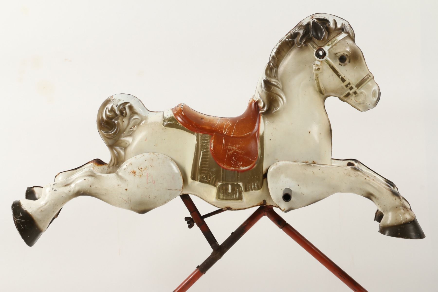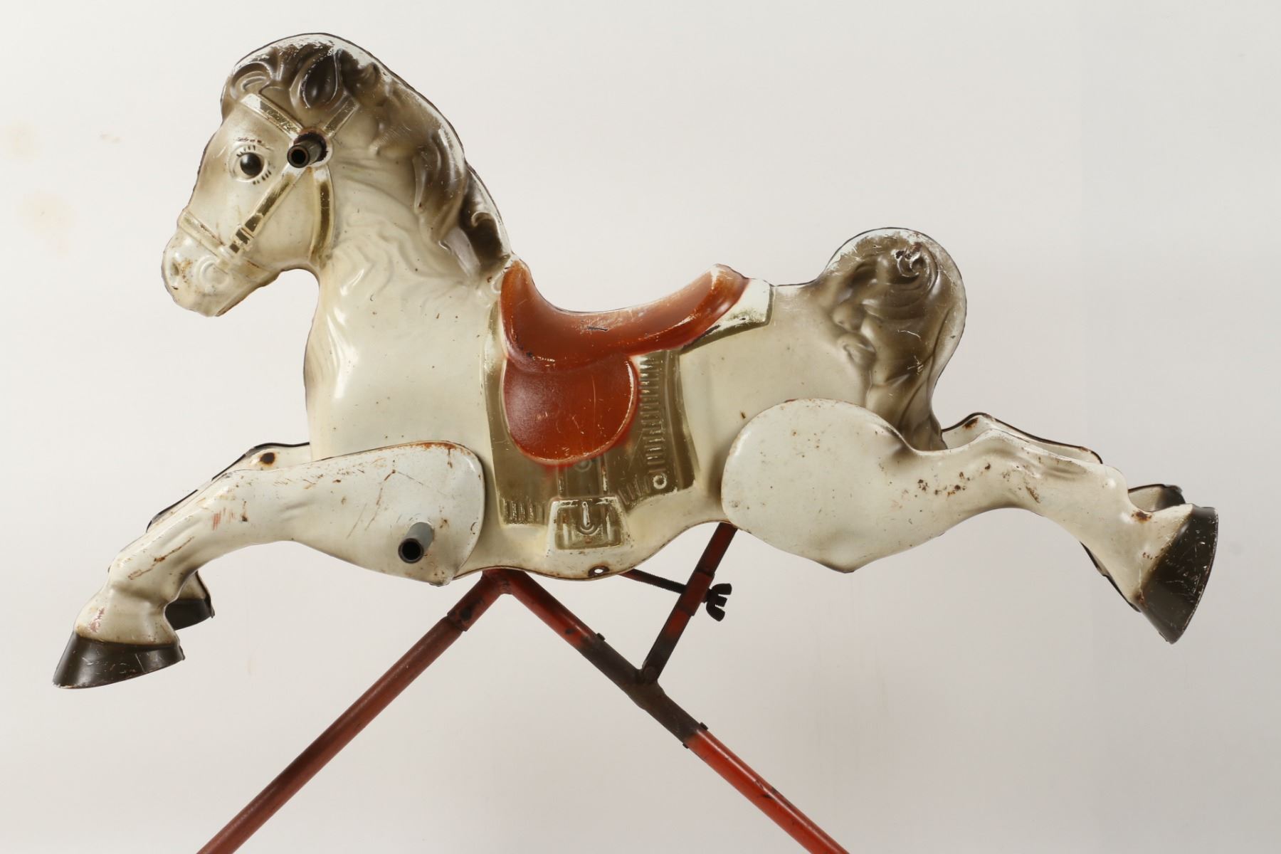 38” x 35” h. Oxidation, fading and wear. Frame re-welded and reinforced. Complete. Partial label on front. $200-300.