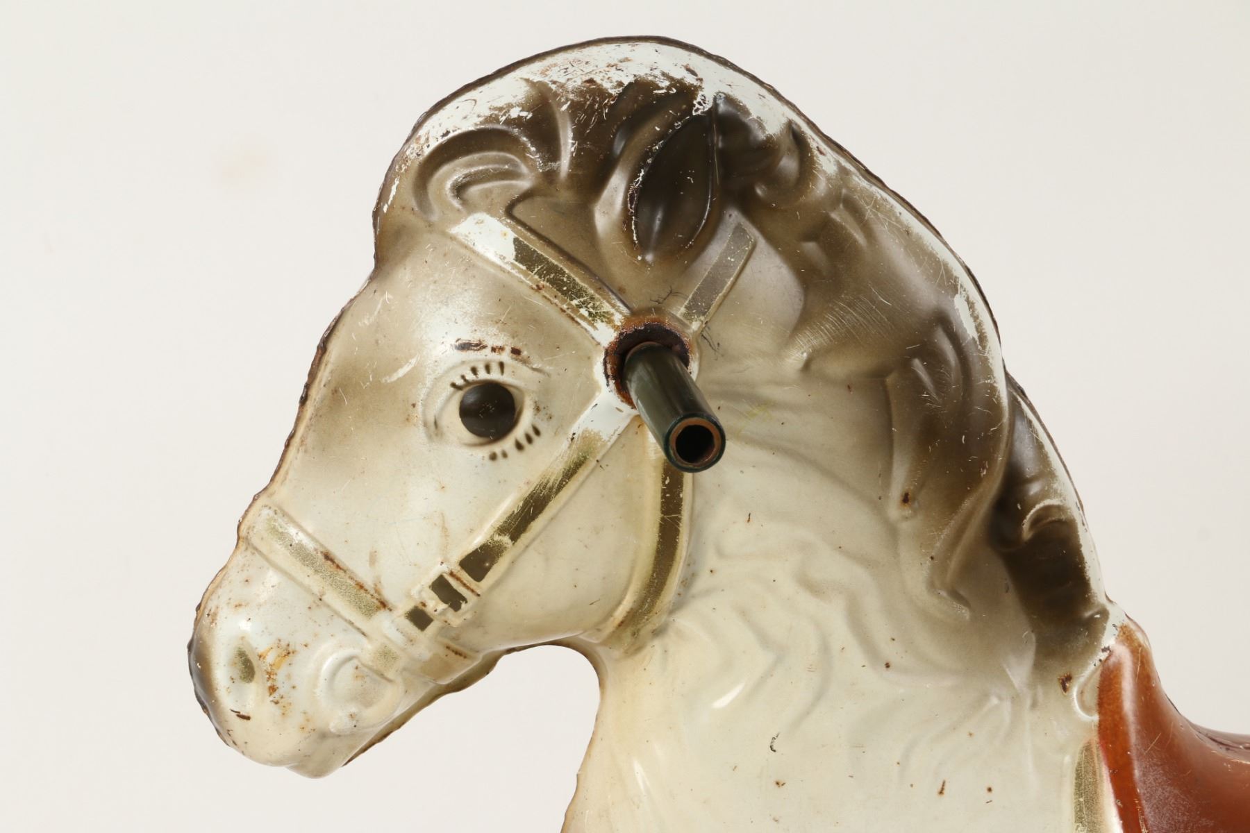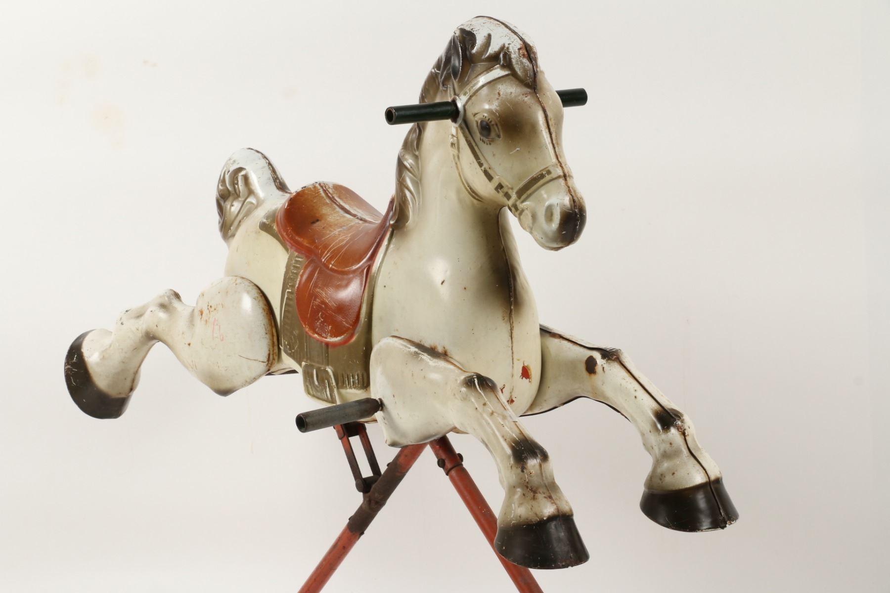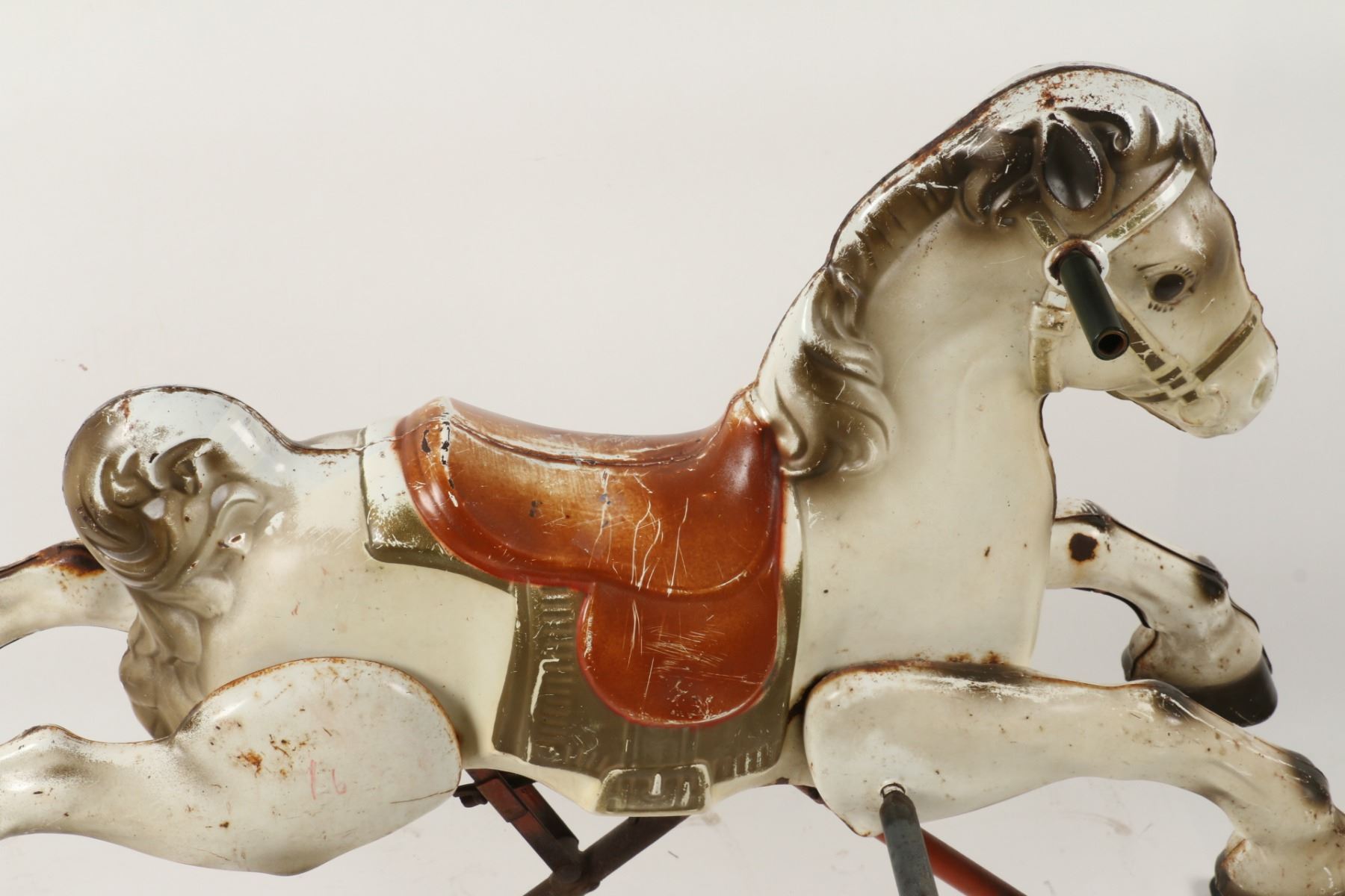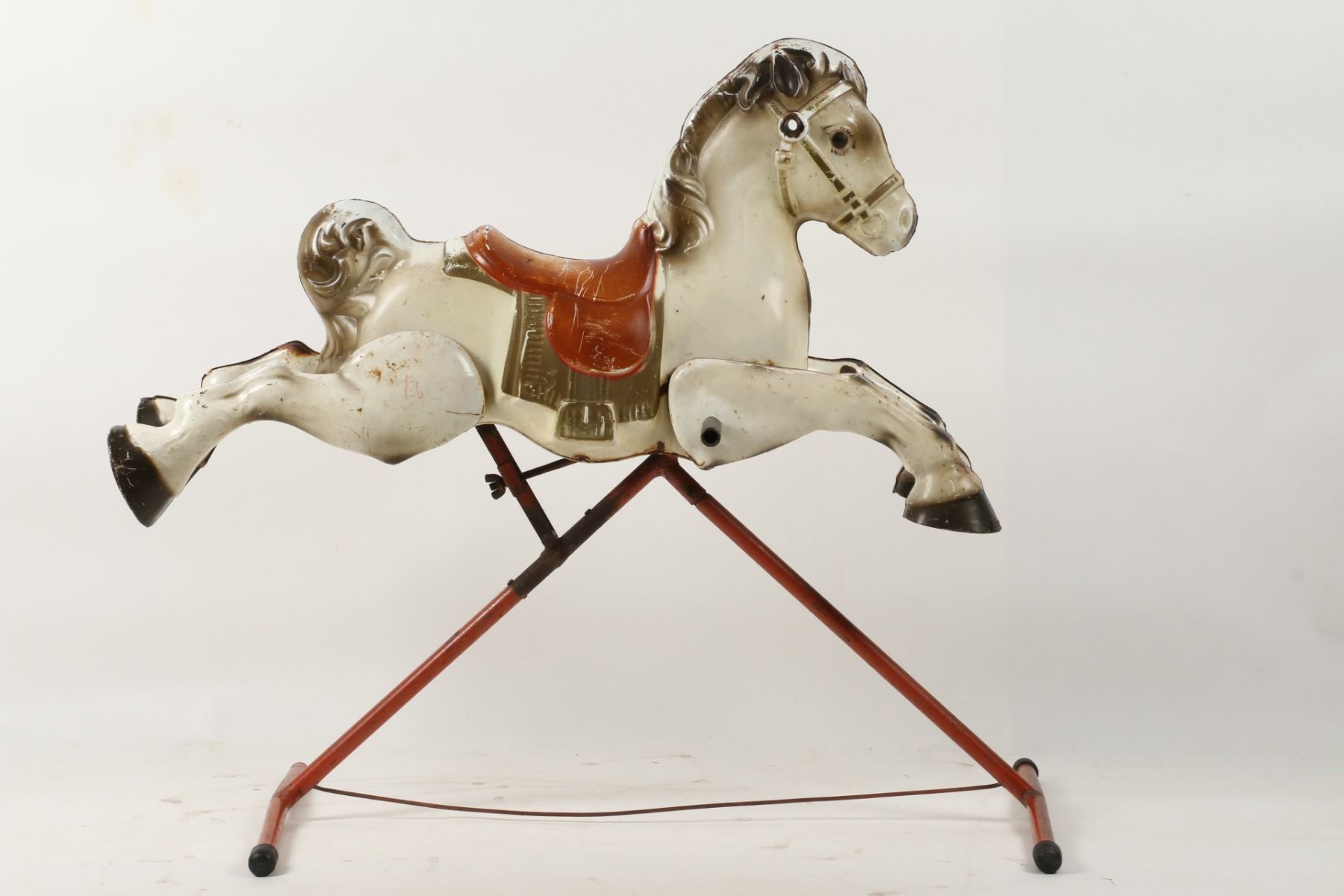38” x 35” h. Oxidation, fading and wear. Frame re-welded and reinforced. Complete. Partial label on front. $200-300.