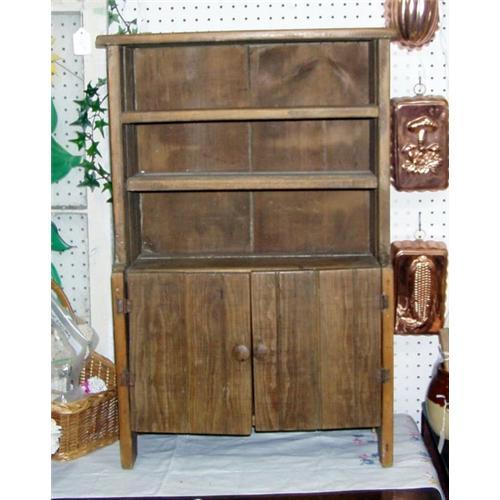 It is impossible to look at this tiny primitive treasure and not think about the loving hands that made it for his favorite princess. It is made of weathered 3/4" thick board on the sides, back, and shelves, while the doors are tongue & groove beadboard. The shelves are permanently fastened. Small head nails were used originally and there are some larger head nails that seem to have come at some point afterward as a repair. Remnants of white paint can still be seen, though it is hard to say if it was painted when it became this cupboard or if it was from a previous incarnation. That about does it for the physical details, but it's hard to put a lasso around the right words to capture the heart-tugging charm of this sweetheart.