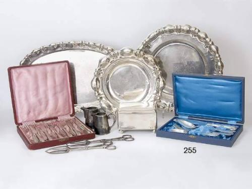 Silver, 4 pieces of tableware with baroque style decoration on the terminals, knife with rust-proof blade, circa 1960, marked, PV maker’s mark, gross weight 180.0 g, in good condition.