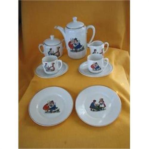 This beautiful children's tea set is marked on the bottom in red: Germany #8. In bright colors of red, blue, browns and greens this 11 piece set in a pattern of children at play with gold trim on a white porcelain background consists of: the teapot and lid that measures 6 1/8 inches tall and 6 inches spout to handle, the creamer that measures 2 1/2 inches tall, the sugarbowl with lid that measures 3 1/2 inches tall, 2 cups that measure 2 inches tall and 2 inches across the rim and 2 saucers that measure 4 1/2 inches in diameter. Circa 1900 it's amazing that this dainty set has survived and must have been played with very gently and loved dearly. In very good + condition without chips or cracks it would be a great addition to any Child's Room or Tea Set Collection. <BR>SH & Ins. will be quoted after orders placed. If you have questions please contact me and thank you for looking.