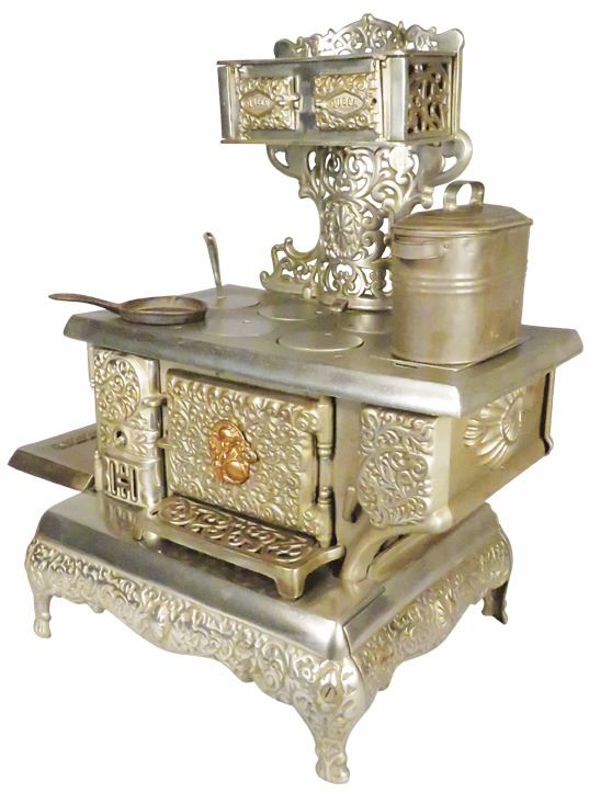 Late 1800's Child's "The Queen" Cook Stove. Nickel plated cast iron. Comes with accessories. Excellent original condition. 19 1/2 X 21 3/4 X 12 inches.