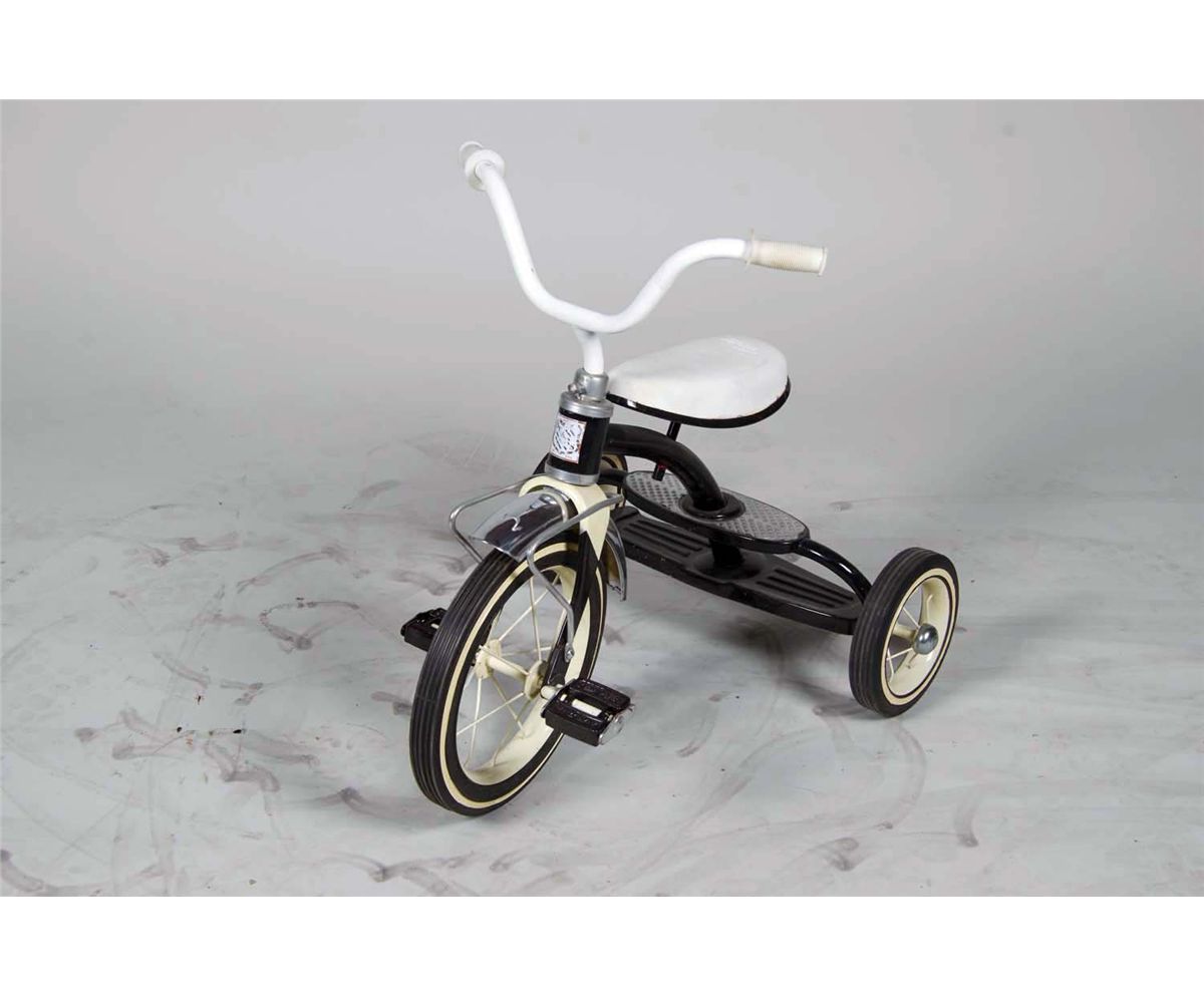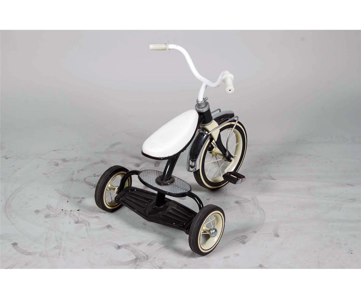 Black and white with white wall wheels, white plastic Troxel seat, Radio Flyer pedals, and Sears front sticker. Condition (Very good). Size 25" L.