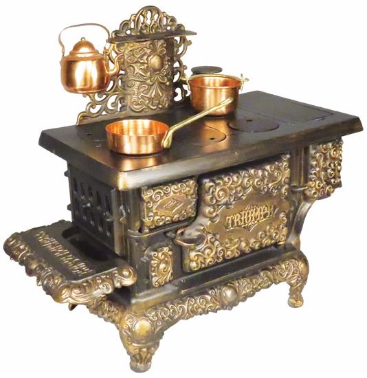Late 1800's Child's "Triumph" Cook Stove. Black with copper antique washed cast iron. Comes with copper accessories. Excellent condition. 15 1/2 X 14 1/2 X 7 1/2 inches.