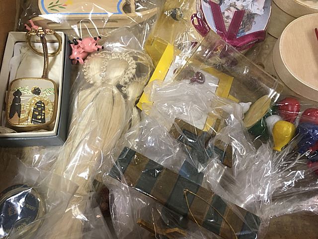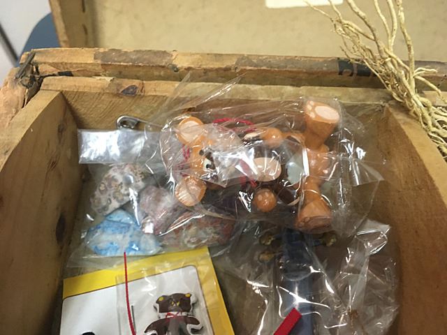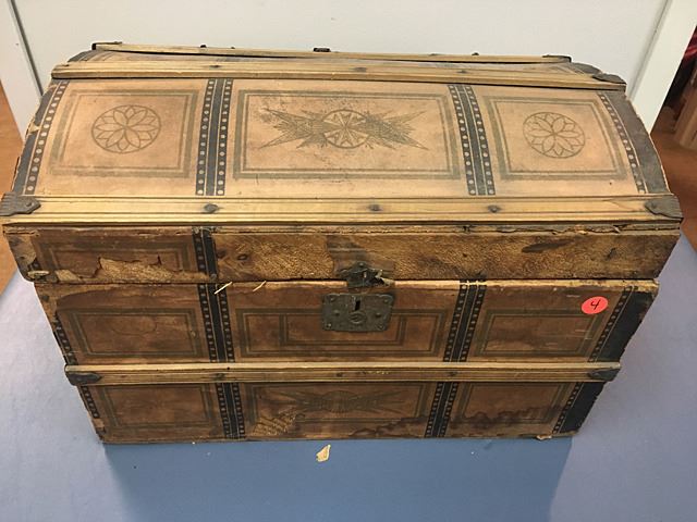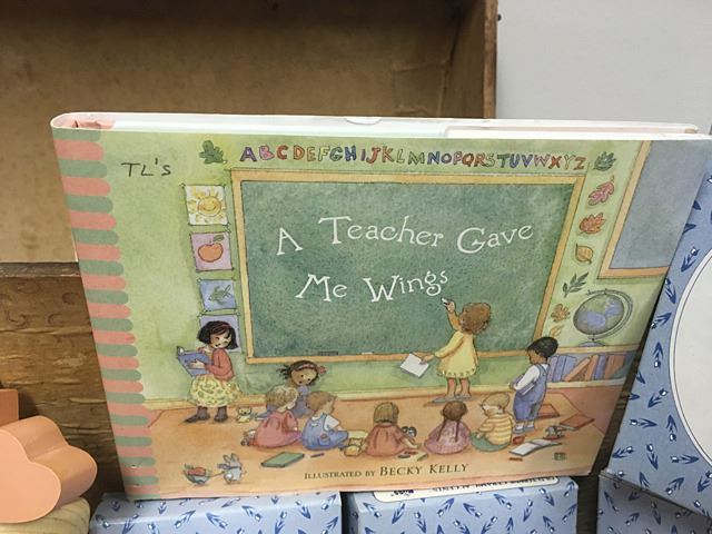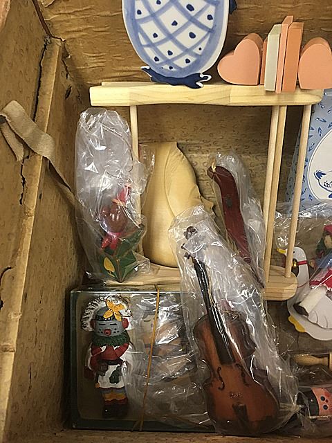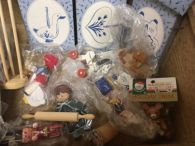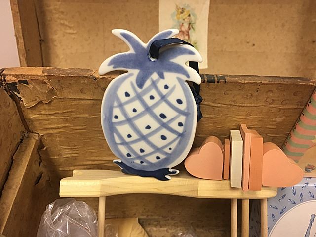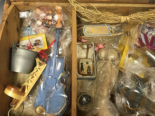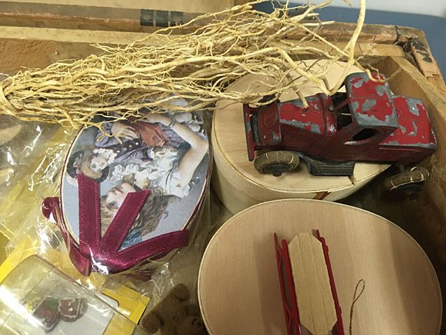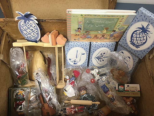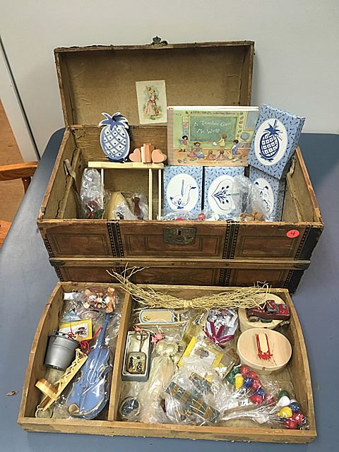 Vintage child's trunk filled with estate items including wooden toys ornaments, "A Teacher Gave Me Wings" child's book, blue and white country ornaments, vintage toy trunk, etc.