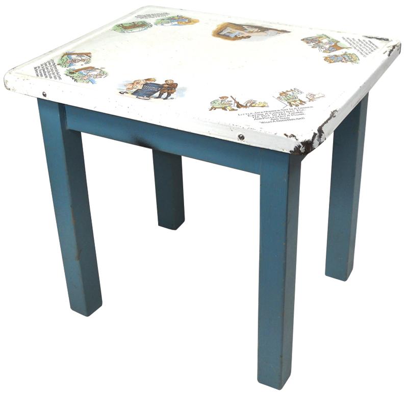 Child's advertising table w/porcelain top, has adv for Telling's Ice Cream & Belle Vernon Milk, nursery rhyme vignettes decorate the corners, a Rare table in Good cond w/some porcelain damage, 18"H x 20"W x 16"D.