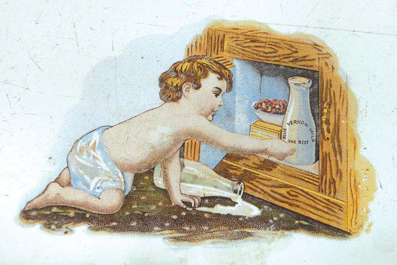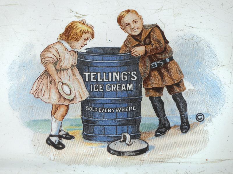 Child's advertising table w/porcelain top, has adv for Telling's Ice Cream & Belle Vernon Milk, nurs