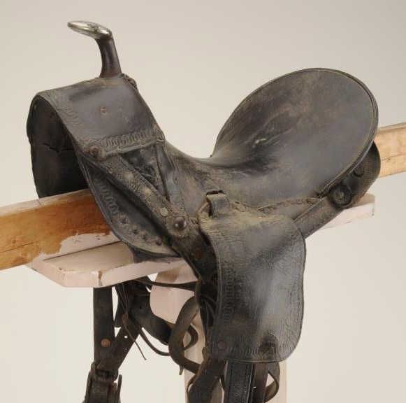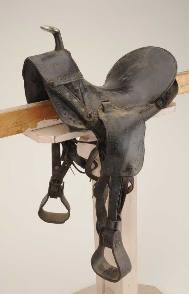Child’s leather saddle with wooden stirrups in overall fair to good condition showing lots of even wear. Gale Kennedy Historical West. Est.: $300-$600.
