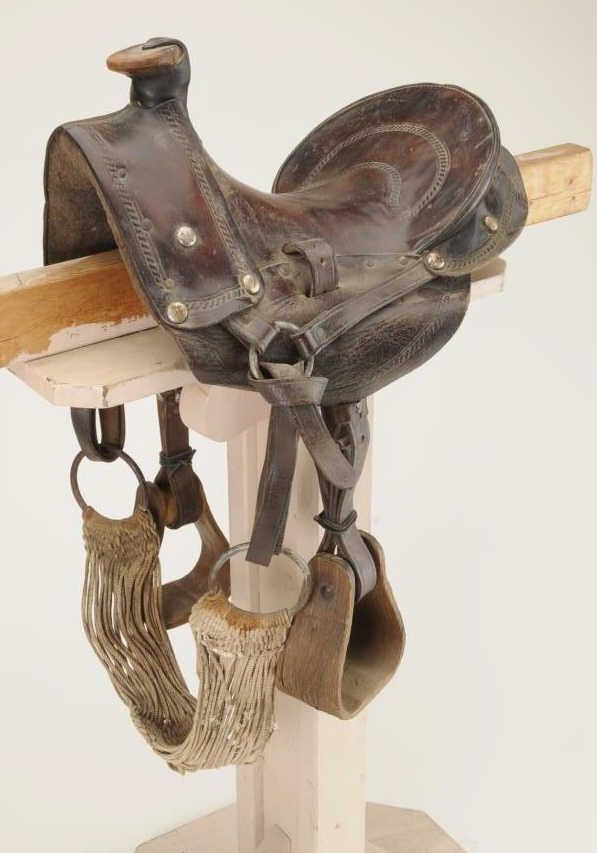 Child’s loop seat leather saddle with wooden stirrups, unmarked in overall very good condition; simple tooling outlines to major leather parts of saddle. Gale Kennedy Historical West. Est.: $300-$600.