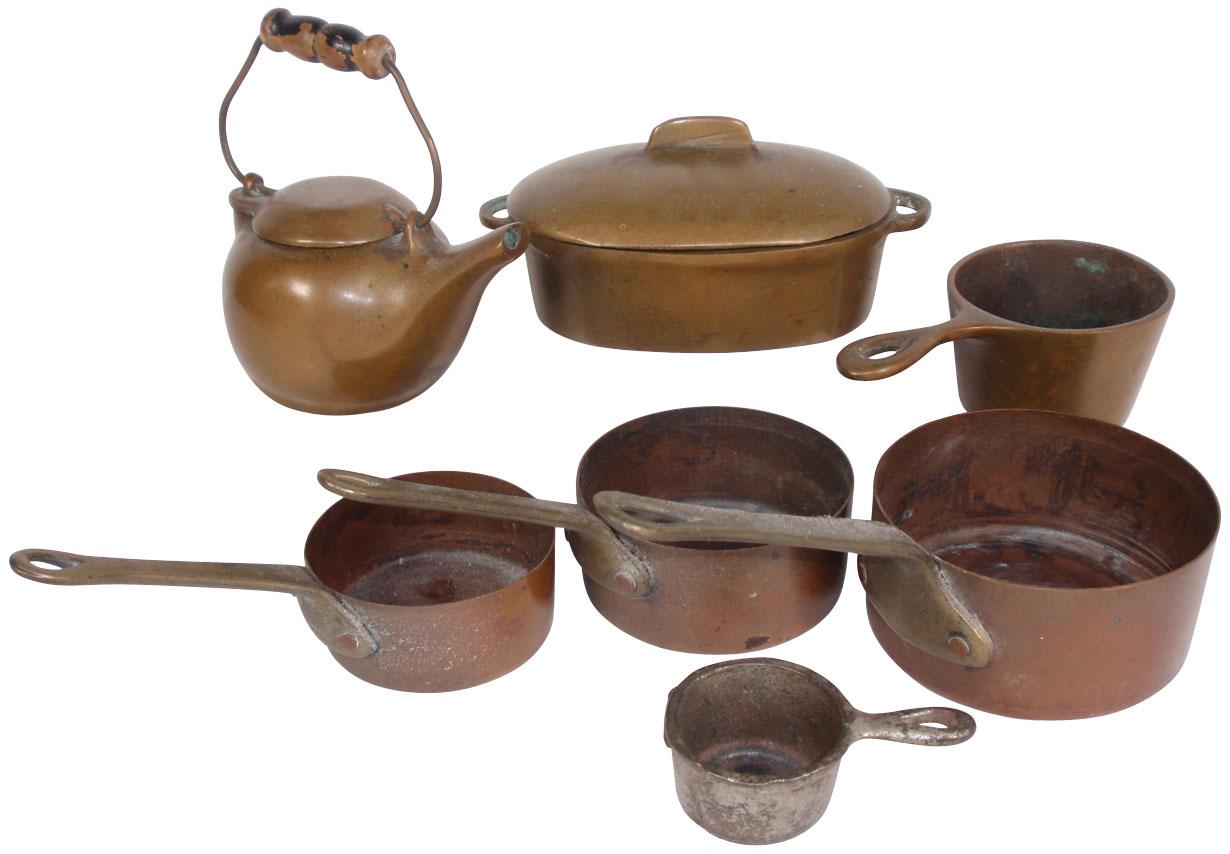Child's set of copper cookware, 7 total pcs, small pot is cast iron, early 1900's, Exc cond, 1" to 4"H.