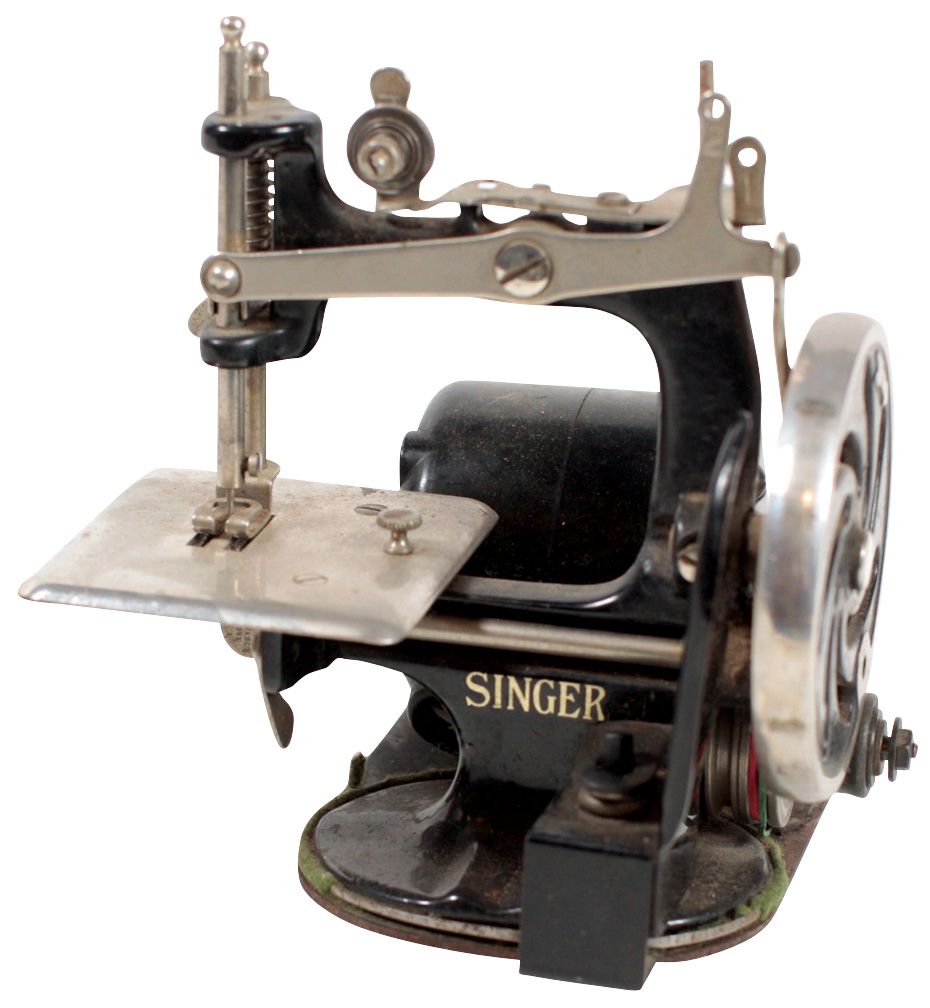 Child's sewing machine, Singer Model J-1, electric, cast iron, a rare model in Exc cond w/some fray on cord, machine compl w/knob but knob not shown in picture, 7"H x 6"W.