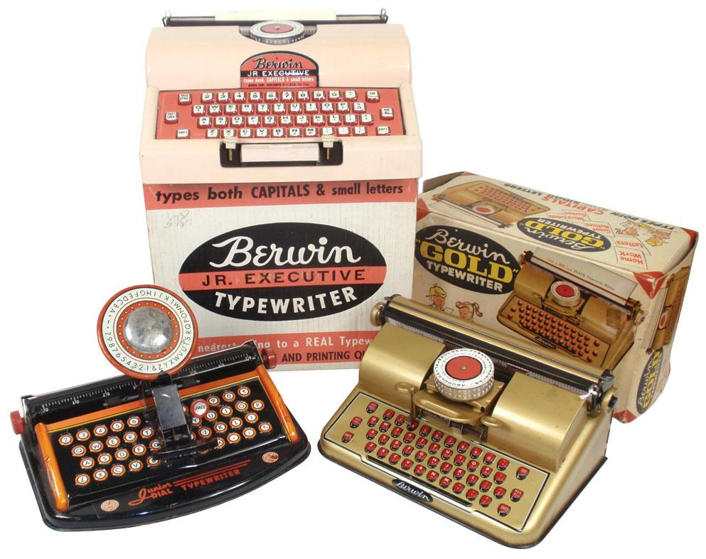 Child's toy typewriters (3), Berwin Jr. Executive, Berwin Gold & Marx Jr. Dial, all VG cond, largest